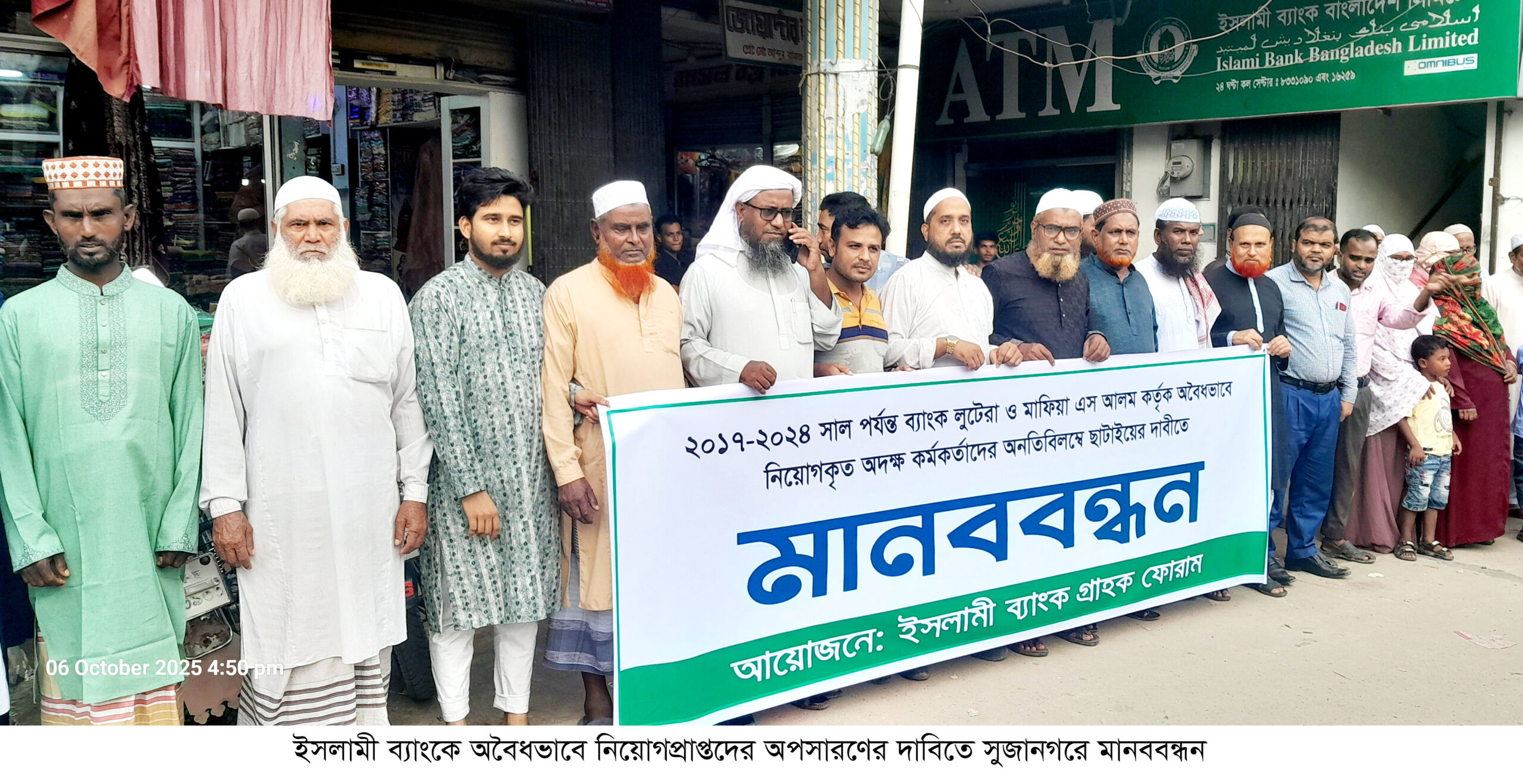 এম এ আলিম রিপন,সুজানগরঃ ইসলামী ব্যাংক বাংলাদেশে এস আলম গ্রুপের অবৈধভাবে নিয়োগ দেওয়া অদক্ষ কর্মকর্তা-কর্মচারীদের অপসারণের দাবিতে পাবনার সুজানগরে মানববন্ধন অনুষ্ঠিত হয়েছে।সোমবার (৬ অক্টোবর) ইসলামী ব্যাংক লিমিটেড সুজানগর শাখা কার্যালয়ের সামনে ইসলামী ব্যাংক গ্রাহক ফোরাম ও বৈষম্যবিরোধী চাকুরী প্রত্যাশী পরিষদের ব্যানারে এ মানববন্ধন কর্মসূচি পালিত হয়। এতে বক্তব্য রাখেন ইসলামী ব্যাংক গ্রাহক ফোরামের আব্দুল মমিন, কেরামত আলী, রোজিনা খাতুন ও আব্দুল কাদের প্রমুখ। বক্তারা বলেন, ইসলামী ব্যাংক থেকে দ্রুততম সময়ের মধ্যে এস আলমের মাধ্যমে অবৈধভাবে নিয়োগপ্রাপ্তদের অপসারণ করতে হবে। আগামী বৃহস্পতিবারের মধ্যে পদক্ষেপ না নিলে শেয়ারহোল্ডার ও গ্রাহকরা বৃহত্তর আন্দোলনের ডাক দেবেন বলে হুঁশিয়ারি দেন তারা। বক্তারা অভিযোগ করেন, ২০১৭ সালে এস আলম গ্রুপ রাষ্ট্রীয় প্রভাব ব্যবহার করে ইসলামী ব্যাংক দখল করে নেয় এবং বৈধ মালিক ও বিদেশি শেয়ারহোল্ডারদের ভয়ভীতি দেখিয়ে বিতাড়ন করে। পরে ব্যাংকের নিয়োগ প্রক্রিয়া বাতিল করে গোপনে চট্টগ্রাম, বিশেষ করে পটিয়া উপজেলার হাজারো অযোগ্য ব্যক্তিকে চাকরি দিয়ে ব্যাংকের কর্মপরিবেশ ধ্বংস করে।