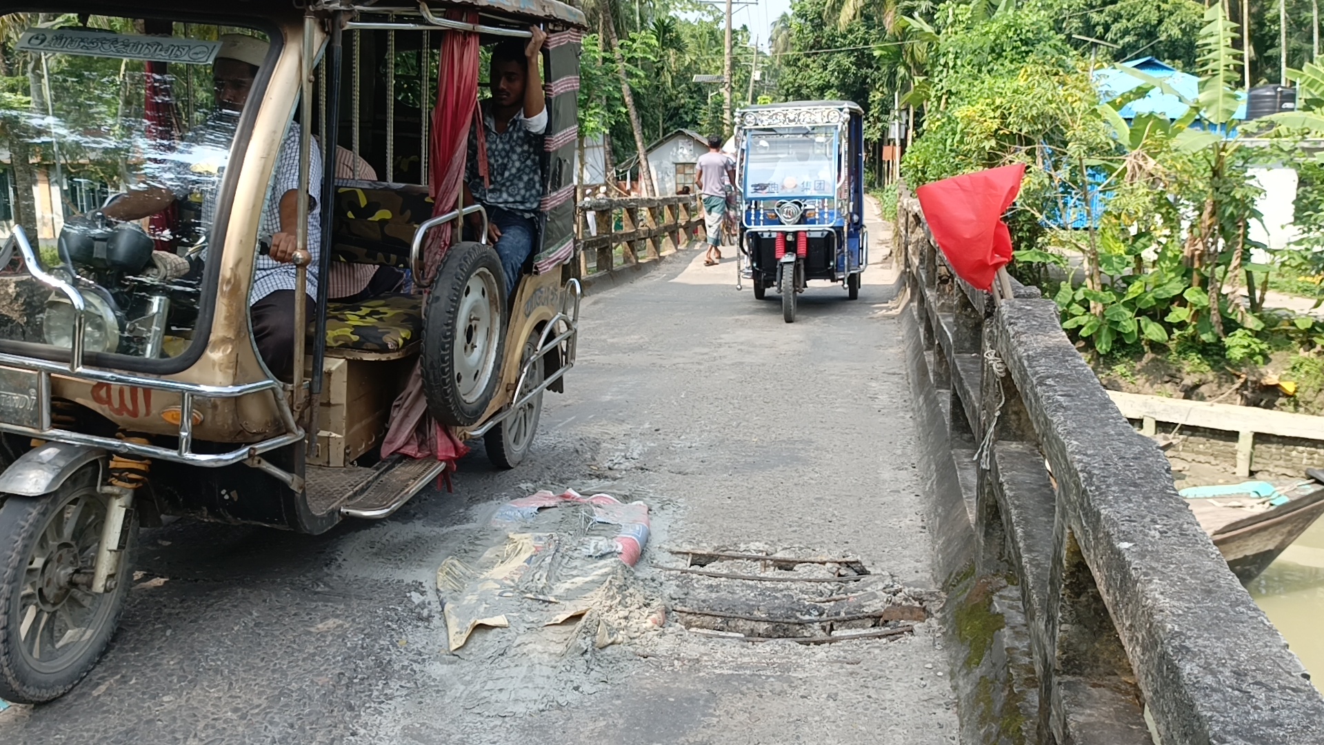 রবিবার সরেজমিনে দেখা গেছে, ব্রীজের ভাঙা জায়গাগুলোতে লোহার পাত ও ইট–পাথরের সুড়কি দিয়ে অস্থায়ীভাবে মেরামতের চেষ্টা করা হয়েছে। অনেক স্থানে রড বেরিয়ে পড়েছে, এবং টমটম উঠলেই ব্রীজ দুলে ওঠে।