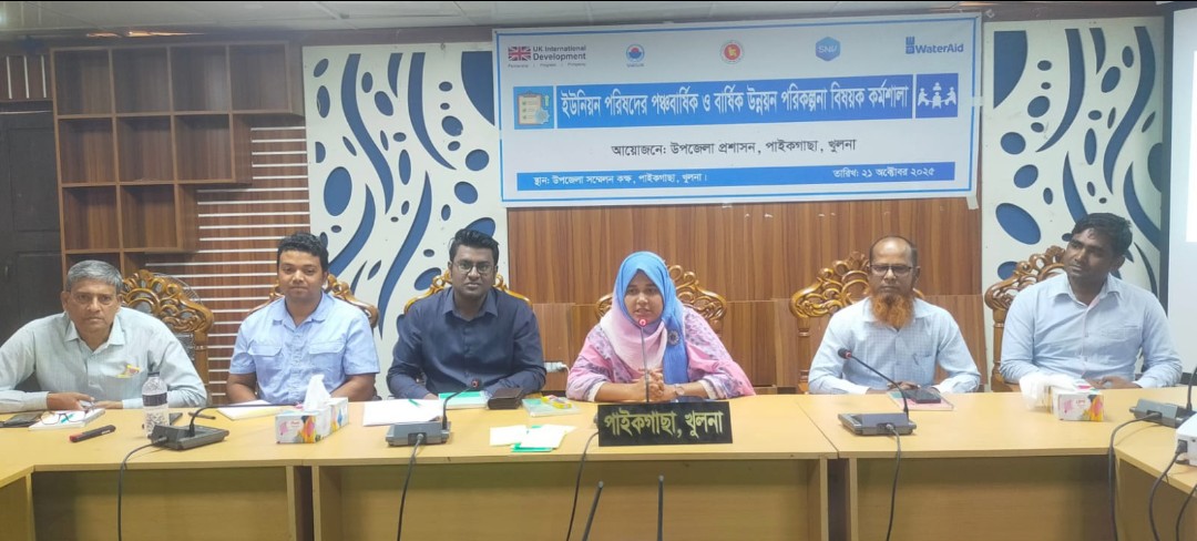 খুলনার পাইকগাছায় ইউনিয়ন পরিষদের পঞ্চবার্ষিক ও বার্ষিক উন্নয়ন পরিকল্পনা বিষয়ক কর্মশালা অনুষ্ঠিত হয়েছে। ২১ অক্টোবর মঙ্গলবার সকালে উপজেলা পরিষদ মিলনায়তনে দাতা সংস্থা ওয়াটার এইড বাংলাদেশ এবং উন্নয়ন সংস্থা নবলোক এর সহযোগিতায় উপজেলা প্রশাসন এ কর্মশালার আয়োজন করে। উপজেলা নির্বাহী অফিসার মাহেরা নাজনীন এর সভাপতিত্বে অনুষ্ঠিত কর্মশালায় বিশেষ অতিথি ছিলেন সহকারী কমিশনার ভূমি মোঃ ফজলে রাব্বি, উপজেলা প্রকৌশলী শাফিন শোয়েব, উপজেলা মাধ্যমিক শিক্ষা কর্মকর্তা শাহজাহান আলী শেখ, শিক্ষা অফিসার বিদ্যুৎ রঞ্জন সাহা, মহিলা বিষয়ক কর্মকর্তা রেশমা আক্তার ও জনস্বাস্থ্য প্রকৌশল দপ্তরের উপ সহকারী প্রকৌশলী প্রশান্ত পাল। কর্মশালায় মূল প্রবন্ধ উপস্থাপন করেন ওয়াটার এইড বাংলাদেশ প্রতিনিধি সুমন সাহা। উপস্থিত ছিলেন ভারপ্রাপ্ত ইউপি চেয়ারম্যান আব্দুল্ল্যাহ সরদার, শেখ খোরশেদুজ্জামান, নবলোকের প্রকল্প ব্যবস্থাপক ওমর ফারুক জুয়েল, বিএম নাহিদ হাসান, প্রোগ্রাম অফিসার কাজী ফারহানা আফরোজ, ফাইনান্স ও এডমিন অফিসার পবিত্র মন্ডল ও রেহেনা পারভিন। কর্মশালায় বিভিন্ন ইউনিয়ন পরিষদের চেয়ারম্যান, ইউপি সদস্য ও ইউনিয়ন পরিষদের প্রশাসনিক কর্মকর্তারা অংশ গ্রহণ করেন