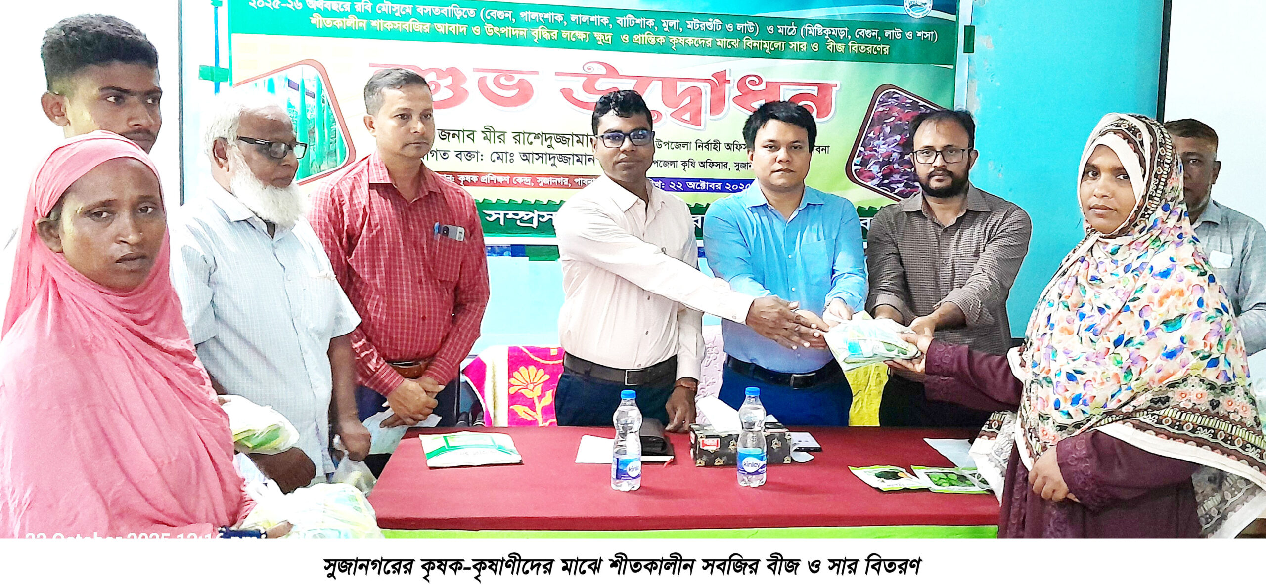 এম এ আলিম রিপন,সুজানগরঃ শীতকালীন শাকসবজির উৎপাদন বৃদ্ধির লক্ষ্যে সুজানগর উপজেলার কৃষক-কৃষাণীদের মাঝে সবজির বীজ ও সার বিতরণ ককার্যক্রমের উদ্বোধন করা হয়েছে। কৃষি প্রণোদনা কর্মসূচীর আওতায় এই বীজ ও সার বিতরণ করা হয়েছে। সুজানগর উপজেলা নির্বাহী অফিসার মীর রাশেদুজ্জামান রাশেদ বুধবার প্রধান অতিথি হিসেবে উপস্থিত থেকে এই কার্যক্রমের উদ্বোধন করেন। উপজেলা কৃষি অফিসার কৃষিবিদ আসাদুজ্জামানের সভাপতিত্বে ও উপজেলা উপ সহকারী উদ্ভিদ সংরক্ষণ কর্মকর্তা আলমগীর হোসেনের সঞ্চালনায় অনুষ্ঠানে স্বাগত বক্তব্য দেন উপজেলা কৃষি সম্প্রসারণ অফিসার কৃষিবিদ জাহিদ হোসেন ।২০২৫-২৬ অর্থবছরের এই প্রণোদনা কর্মসূচীর আওতায় বসতবাড়িতে চাষযোগ্য ৩২৫ জন কৃষক-কৃষাণীকে ৭ ধরনের সবজির বীজ এবং মাঠে চাষযোগ্য ৫০০ জন কৃষক-কৃষাণীকে সার ও বীজ দেওয়া হচ্ছে। এর মধ্যে ৯০ জন কৃষককে লাউ, ১৪০জনকে মিষ্টিকুমড়া, ১৪০ জনকে বেগুন এবং ১৩০ জনকে শসার বীজ প্রদান করা হয়। পাশাপাশি প্রতিজনকে ১০ কেজি ডিএপি ও ১০ কেজি এমওপি সার দেওয়া হয়। অনুষ্ঠানে সভাপতির বক্তব্যে উপজেলা কৃষি অফিসার কৃষিবিদ আসাদুজ্জামান বলেন, প্রণোদনা কর্মসূচী সরকারের বিশেষ উদ্যোগ। সরকার আগাম শীতকালীন শাকসবজির উৎপাদন বৃদ্ধির জন্য কৃষকদের এ বীজ ও সার দিচ্ছে। আপনারা যদি যত্নসহকারে চাষ করেন তাহলে কৃষি আরও সমৃদ্ধ হবে এবং সুজানগর উপজেলায় কৃষি হবে আরও গতিশীল ও উন্নত। প্রধান অতিথির বক্তব্যে উপজেলা নির্বাহী অফিসার মীর রাশেদুজ্জামান রাশেদ বলেন, সরকারের এই সহায়তা সুজানগর উপজেলার কৃষক=কৃষাণীদের শাকসবজি উৎপাদনে ব্যাপক ভূমিকা রাখবে।