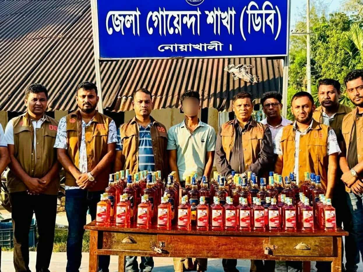 আল ফারুক, নোয়াখালী মহোদয়ের সার্বিক দিক নির্দেশনায়, জনাব মোহাম্মদ ইব্রাহীম, অতিরিক্ত পুলিশ সুপার (ক্রাইম এন্ড অপস্), নোয়াখালীর তত্ত্বাবধানে ও জনাব মোহাম্মদ আশরাফ উদ্দিন, অফিসার ইনচার্জ, জেলা গোয়েন্দা শাখা, নোয়াখালী এর নেতৃত্বে এসআই(নিঃ) মোঃ জাকির হোসেন সঙ্গীয় অফিসার ফোর্সের সহায়তায় বর্ণিত ঘটনাস্থলে পৌঁছাইয়া আসামী মোঃ ইয়াছিন আরাফাত(২২) কে ধৃত করেন ও তাহার হেফাজত থেকে ০৫(পাঁচ) বোতল বিদেশী মদ উদ্ধার করেন। ডিবি পুলিশের উপস্থিতি টের পাইয়া ঘটনাস্থল থেকে আসামী মোঃ আরমান হোসেন(২৫) তাহার বসতঘরের পিছনের দরজা দিয়া পালাইয়া যায়। ধৃত আসামীকে জিজ্ঞাসাবাদে সে তাহার বসতঘর সংলগ্ন ডোবাতে আরো মদের বোতল রক্ষিত আছে মর্মে স্বীকার করে। তখন ধৃত আসামীর দেখানো ও ডোবাতে বিশেষ কায়দায় রক্ষিত অবস্থা থেকে বাহির করিয়া দেওয়া মতে আরো ৮৯(ঊননব্বই) বোতল বিদেশী মদ উদ্ধারসহ সর্বমোট ৯৪(চুরানব্বই) বোতল বিভিন্ন ব্র্যান্ডের বিদেশী মদ জব্দতালিকা মূলে জব্দ করা হয়।