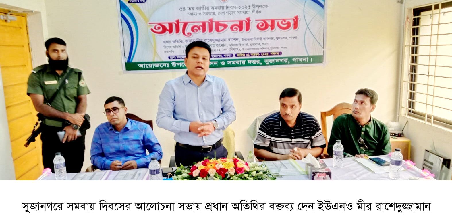 সুজানগর(পাবনা)প্রতিনিধি : যথাযথ মর্যাদা ও উৎসাহ-উদ্দীপনার মধ্য দিয়ে পাবনার সুজানগরে ৫৪তম জাতীয় সমবায় দিবস পালিত হয়েছে।এ বছর দিবসের মূল প্রতিপাদ্য ‘সাম্য ও সমতায়, দেশ গড়বে সমবায়’।এ উপলক্ষ্যে শনিবার সকালে সুজানগর উপজেলা পরিষদ প্রাঙ্গণে জাতীয় পতাকা ও সমবায় পতাকা উত্তোলন করা হয়। পায়রা ও বেলুন উড়িয়ে অনুষ্ঠানের উদ্বোধন করেন উপজেলা নির্বাহী অফিসার মীর রাশেদুজ্জামান রাশেদ।পরে স্থানীয় বিভিন্ন শ্রেণীর মানুষের অংশগ্রহণে এক বর্ণাঢ্য র্যালি বের হয়। র্যালিটি পৌর শহরের বিভিন্ন সড়ক প্রদক্ষিণ করে উপজেলা পরিষদ চত্বরে গিয়ে শেষ হয়। শেষে উপজেলা পরিষদ মিলনায়তনে উপজেলা সমবায় অফিসার দেলোয়ার হোসেন বিদ্যুৎ এর সভাপতিত্বে ও ফজলুর রহমানের সঞ্চালনায় সমবায় দিবসের আলোচনা সভায় প্রধান অতিথির বক্তব্য দেন উপজেলা নির্বাহী অফিসার মীল রাশেদুজ্জামান রাশেদ। অনুষ্ঠানে বিআরডিবির সভাপতি ইয়াকুব আলী প্রামানিক ও শিক্ষক দেলোয়ার হোসেন সহ বিভিন্ন পর্যায়ের ব্যক্তিবর্গ উপস্থিত ছিলেন। প্রধান অতিথির বক্তব্যে উপজেলা নির্বাহী অপিসার মীর রাশেদুজ্জামান রাশেদ বলেন,সমবায় আন্দোলন হল সম্মিলিত প্রচেষ্টা ও অর্থনৈতিক মুক্তির শক্তিশালী হাতিয়ার। দেশের প্রতিটি মানুষের কাছে সমবায়ের সুফল পৌঁছে দিতে সরকার বদ্ধপরিকর।তিনি দেশের আর্থ-সামাজিক উন্নয়নে সমবায়ীদের অবদানের প্রশংসা করে এবং জনগণের অংশগ্রহণ ও স্বচ্ছ ব্যবস্থাপনার মাধ্যমে সমবায় আন্দোলনকে আরও বেগবান করার বিষয়ের উপর গুরুত্বারোপ করে বলেনসমবায় সমিতিগুলো দেশের অর্থনৈতিক বৈষম্য দূর করতে এবং টেকসই উন্নয়ন লক্ষ্যমাত্রা অর্জনে গুরুত্বপূর্ণ ভূমিকা রাখছে। তিনি সমবায় সংশ্লিষ্ট সকলকে সমবায় নীতি ও আদর্শ মেনে চলার আহ্বান জানান।