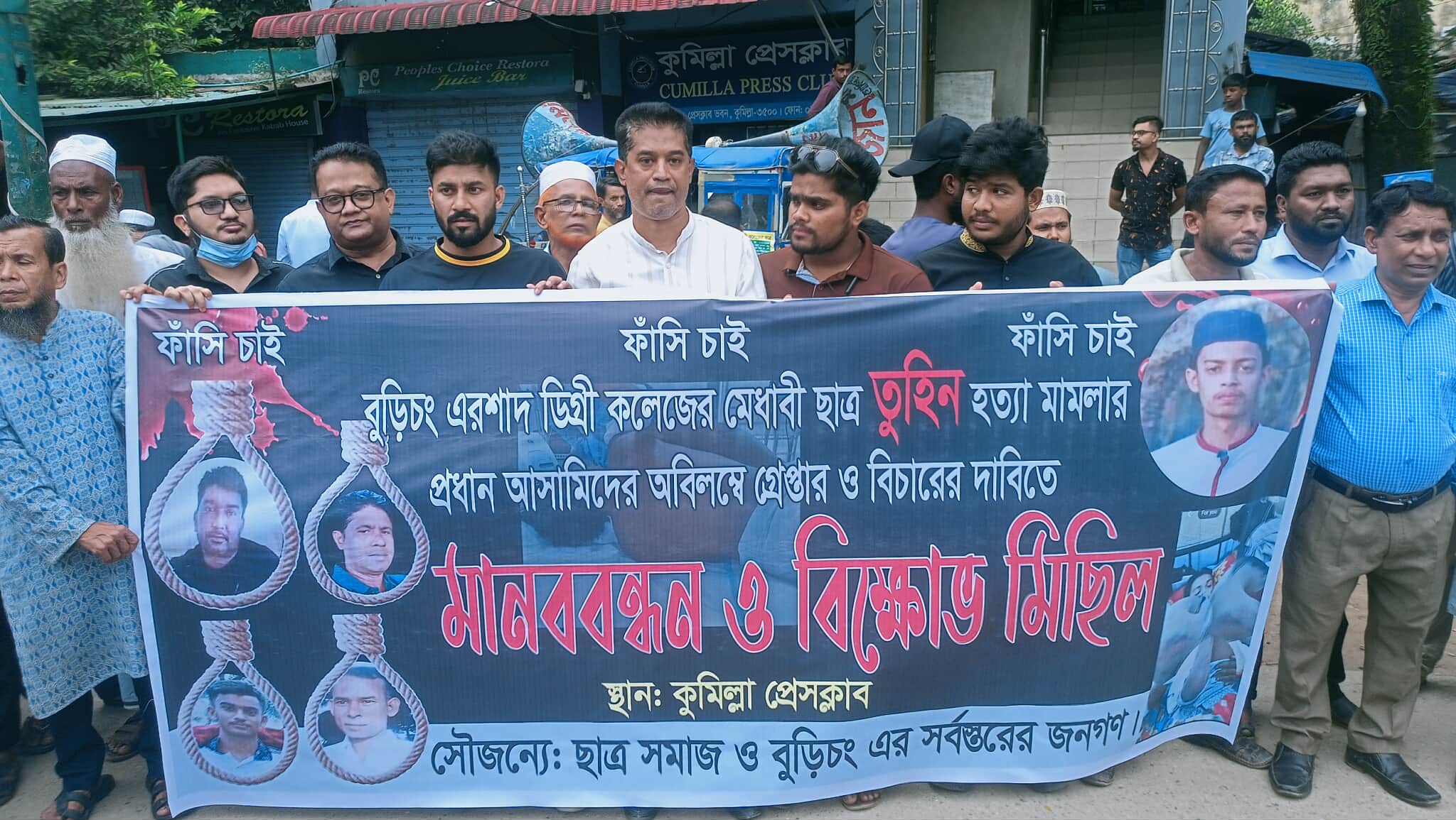কুমিল্লার বুড়িচং উপজেলার শ্রীপুর গ্রামের মেধাবী ছাত্র মোঃ তুহিন হত্যার বিচারের দাবিতে কুমিল্লা প্রেসক্লাবের সামনে মানববন্ধন ও স্মারকলিপি প্রদান অনুষ্ঠিত হয়েছে।