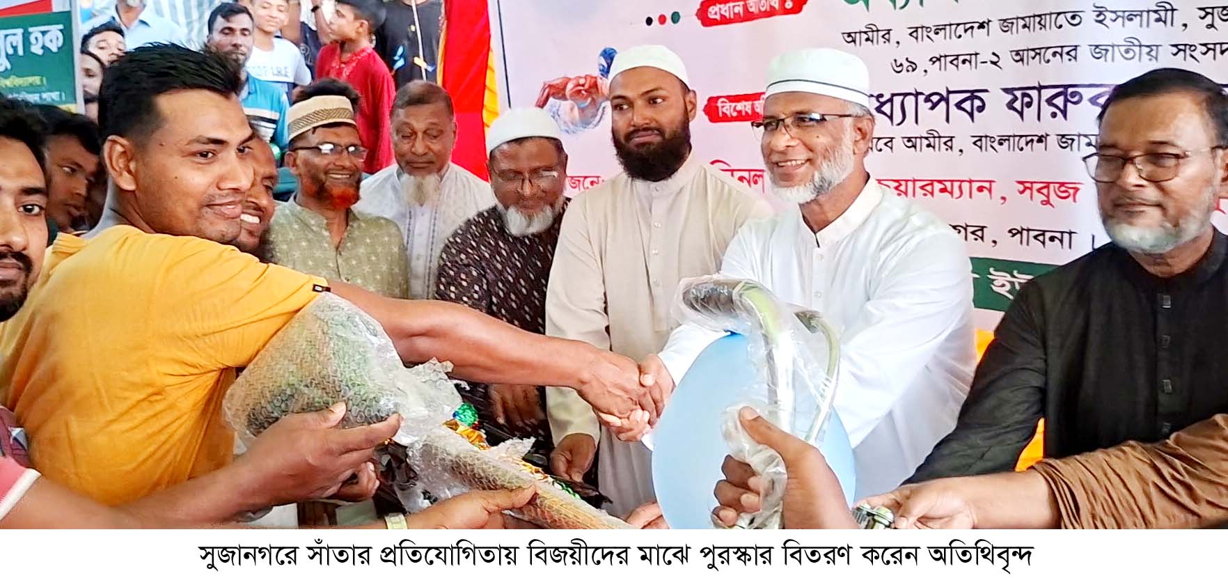 এম এ আলিম রিপন,সুজানগর ঃ পাবনার সুজানগরে উৎসবমুখর পরিবেশে সঁাতার প্রতিযোগিতা ও পুরস্কার বিতরণ অনুষ্ঠিত হয়েছে। হেমরাজপুর সবুজ বাংলা যুব সংঘের চেয়ারম্যান আমিনুল হকের আয়োজনে ও উপজেলা ভঁায়না ইউনিয়নের সর্বস্তরের জনগণের সার্বিক সহযোগিতায় স্থানীয় হেমরাজপুর পুকুরে এই সঁাতার প্রতিযোগিতা অনুষ্ঠিত হয়।প্রতিযোগিতা শেষে আলোচনা ও পুরস্কার বিতরণী অনুষ্ঠানে প্রধান অতিথির বক্তব্য দেন পাবনা-২ আসনে জামায়াত মনোনীত সংসদ সদস্য প্রার্থী ও সুজানগর উপজেলা জামায়াতের আমীর অদ্যাপক কে,এম হেসাব উদ্দিন। বিশেষ অতিথির বক্তব্য দেন সুজানগর উপজেলা জামায়াতের নায়েবে আমীর অধ্যাপক ফারুক-ই আযম। অন্যান্যদের মাঝে বক্তব্য দেন জামায়াত নেতা শাহজাহান মন্ডল ও হাসান আলী প্রমুখ।প্রধান অতিথির বক্তব্যে অধ্যাপক কে এম হেসাব উদ্দিন বলেন, সঁাতার শুধু একটি খেলা নয়, এটি একটি জীবন রক্ষাকারী দক্ষতা। আমাদের দেশে প্রতিবছর নদী ও পুকুরে অসংখ্য মানুষ ডুবে প্রাণ হারান, এজন্য প্রতিটি মানুষের সঁাতার জানা অত্যন্ত প্রয়োজন। সঁাতারের মতো খেলাধুলা মানুষের শরীর-মনকে সুস্থ রাখে ও আত্মবিশ্বাস বাড়ায় । তিনি আরও বলেন, এই প্রতিযোগিতার মাধ্যমে মানুষ শুধু খেলাধুলার প্রতি উৎসাহী হবে না, বরং জীবনের জন্য প্রয়োজনীয় এক গুরুত্বপূর্ণ দক্ষতাও অর্জন করবে। পরে আনুষ্ঠানিকভাবে সঁাতার প্রতিযোগিতায় বিজয়ীদের হাতে পুরস্কার তুলে দেন অতিথিবৃন্দ।