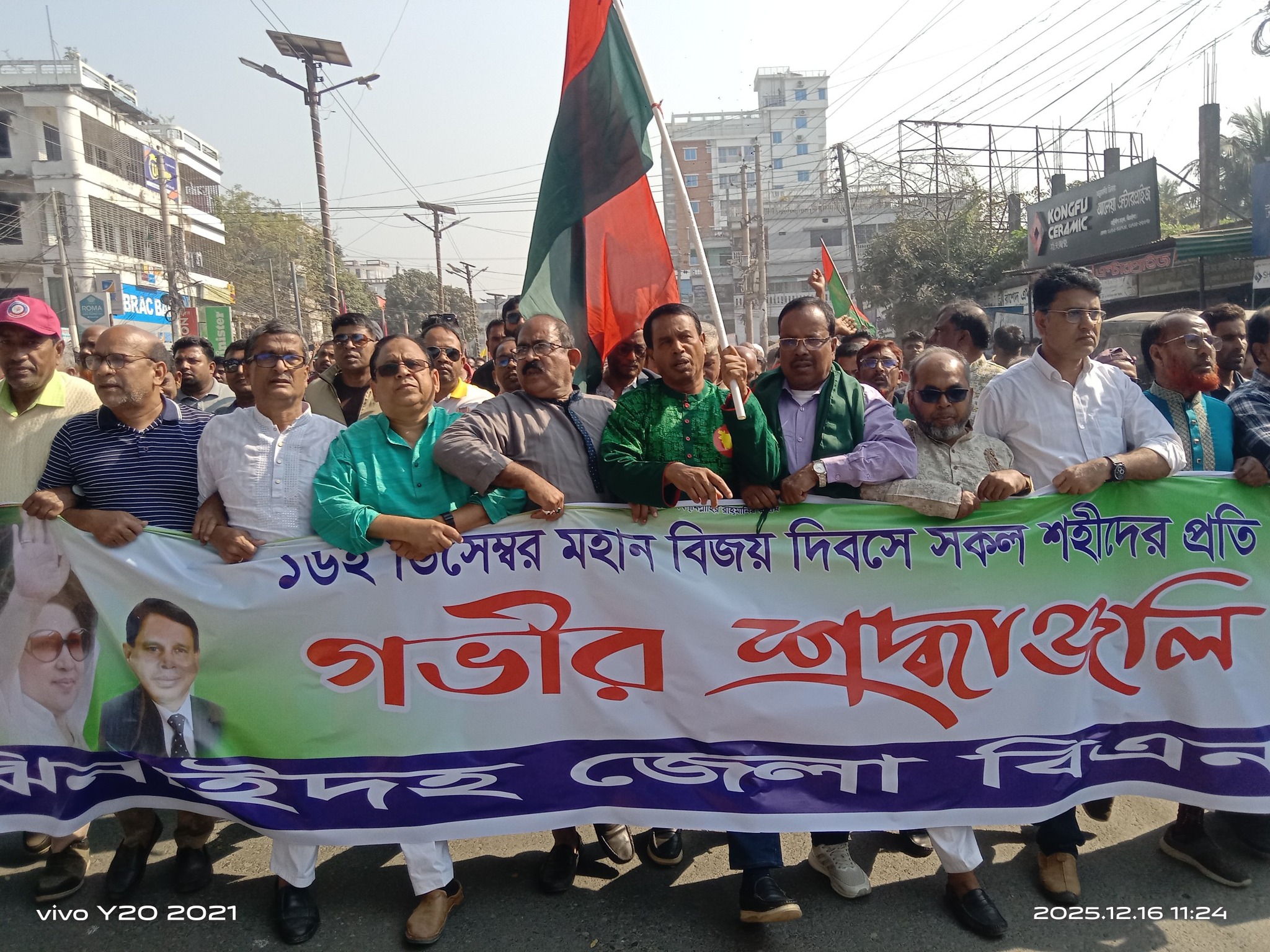 ঝিনাইদহে নানা অনুষ্ঠানের মধ্য দিয়ে পালিত হয়েছে মহান বিজয় দিবস। দিবসটি উপলক্ষে সুর্যোদয়ের সাথে সাথে সদর থানা চত্বরে ৩১ বার তোপধ্বনির মাধ্যমে কর্মসূচীর শুভ সুচনা করা হয়। সোমবার সকাল সাড়ে ৭ টায় “স্বাধীনতা স্মৃতিসৌধে” পুষ্পমাল্য অর্পণ করা হয়। রাষ্ট্রের পক্ষে প্রথমে জেলা প্রশাসক মো. আব্দুল্লাহ আল মাসউদ , পুলিশ সুপার মোঃ মাহফুজ আফজাল । পরে জেলা মুক্তিযোদ্ধা, সরকারি দপ্তর, বেসরকারি, স্বেচ্ছাসেবী সংগঠন ও বিভিন্ন রাজনৈতিক সংগঠনের পক্ষ থেকে পুষ্পমাল্য অর্পণ করা হয়। এছাড়াও কুচকাওয়াজ, আলোচনা সভা সাংস্কৃতিক অনুষ্ঠানের মধ্য দিয়ে পালিত হচ্ছে মহান বিজয় দিবস। পরে মহান বিজয় দিবসের শোভাযাত্রা করেছে ঝিনাইদহ জেলা বিএনপি। সোমবার বেলা সাড়ে ১১ টার দিকে জেলা বিএনপি’র আয়োজনে শহরের ওয়াজির আলী হাইস্কুল মাঠ থেকে শোভাযাত্রা বের করা হয়। শোভাযাত্রাটি শহরের বিভিন্ন সড়ক প্রদক্ষিণ করে চুয়াডাঙ্গা স্টান্ডে গিয়ে শেষ হয়। পরে মুক্তিযুদ্ধ স্মৃতিসৌধে পুষ্পামাল্য অর্পণ করা হয়। এতে জেলা বিএনপি’র সভাপতি এ্যাড. এমএ মজিদ, সাধারণ সম্পাদক জাহিদুজ্জামান মনাসহ বিভিন্ন অঙ্গসংগঠনের হাজার হাজার নেতাকর্মীরা অংশ নেয়। এদিকে সকাল ৯টার ঝিনাইদহ বীরশ্রেষ্ঠ হামিদুর রহমান স্টেডিয়ামে আনুষ্ঠানিক ভাবে জাতীয় পতাকা উত্তোলন এবং বিভিন্ন প্রতিষ্ঠানে কুচকাওয়াজ ও সমাবেশ অনুষ্ঠিত হয়।বীরশ্রেষ্ঠ হামিদুর রহমান স্টেডিয়ামে স্কুল কলেজের শিক্ষার্থীদের ক্রিড়া প্রতিযোগিতা ও শিশু একাডেমীতে শিশুদের চিত্রাংকন প্রতিযোগিতা শেষে পুরস্কার বিতরণ করা । ঝিনাইদহ শিল্পকলা একাডেমীতে মুক্তিযোদ্ধা ও শহীদ মুক্তিযোদ্ধা পরিবারকে সংবর্ধনা প্রদান। এছাড়া দিবসটি উপলক্ষ্যে হাসপাতাল, জেলখানা, শিশুকেন্দ্র, এতিমখানা ও ভবঘুরে কেন্দ্রে উন্নত খাবার পরিবেশন করা হয়। জেলার বিভিন্ন মসজিদ, মন্দির, গীর্জা প্যাগোডা ও অন্যান্য উপসানালয়ে দেশ এবং জাতীর মসৃদ্ধ কামনা করে বিশেষ প্রার্থনা করা হয়।