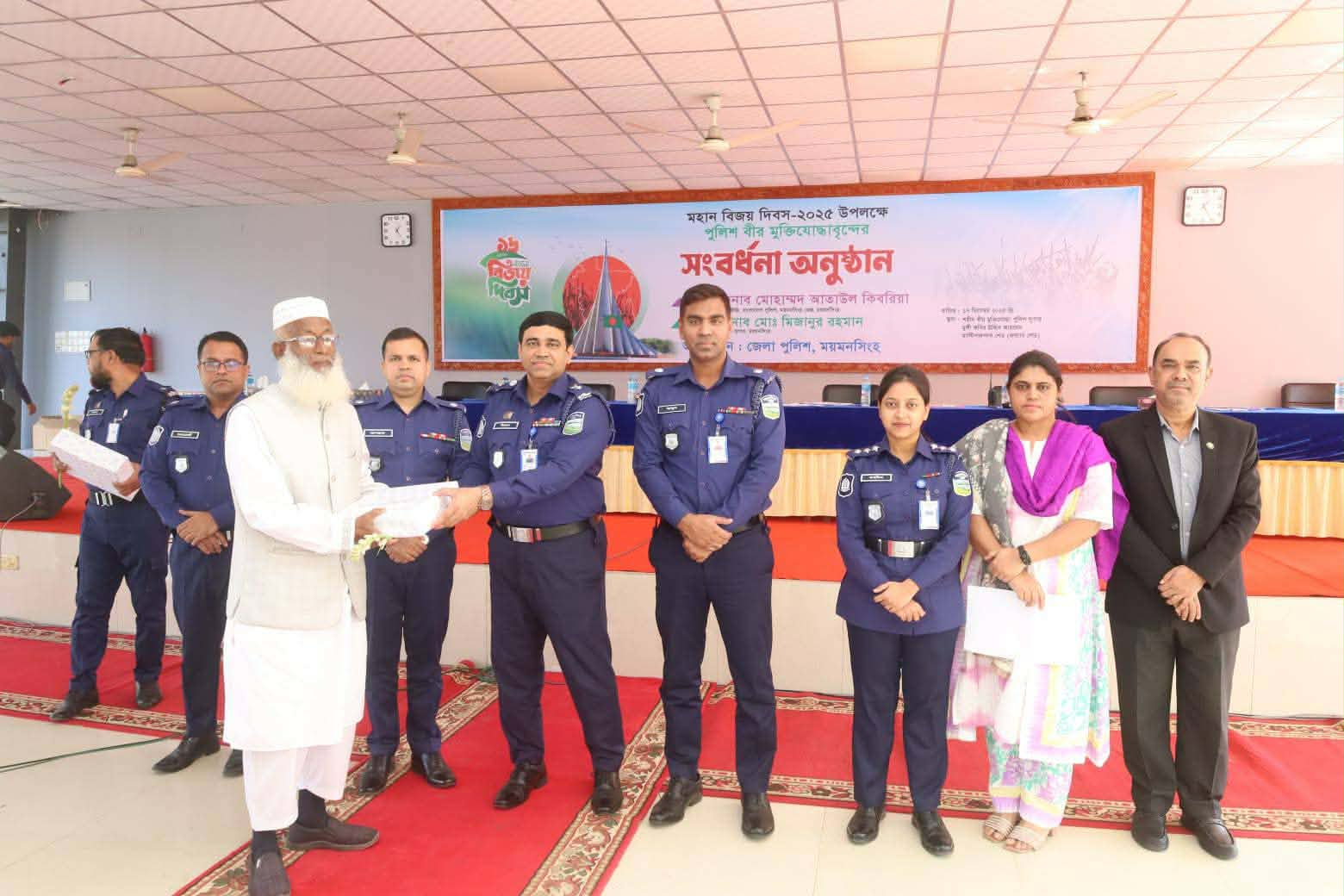 ১৭ ডিসেম্বর ২০২৫ (বুধবার) দুপুর ১২:৩০ ঘটিকায় ময়মনসিংহ জেলার পুলিশ লাইন্সের শহীদ বীর মুক্তিযোদ্ধা পুলিশ সুপার মুন্সী কবির উদ্দিন আহমেদ মাল্টিপারপাস শেড (কল্যাণ শেড) এ মহান বিজয় দিবস উপলক্ষে জেলা পুলিশের পক্ষ থেকে বীর মুক্তিযোদ্ধাদের এই সংবর্ধনা প্রদান করা হয়।