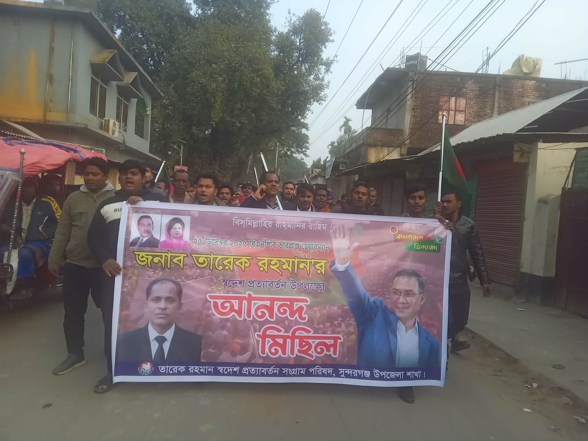 বুধবার বিকেলে তারেক রহমান স্বদেশ প্রত্যাবর্তন সংগ্রাম পরিষদের উপজেলা আহ্বায়ক একেএম ফখরুল ইসলাম মিলুর নেতৃত্বে সুন্দরগঞ্জ পৌরশহরের বাহিরগোলা মসজিদ মোড় থেকে আনন্দ মিছিলটি শুরু হয়। পরে মিছিলটি পৌরশহরের প্রধান প্রধান সড়ক প্রদক্ষিণ করে।