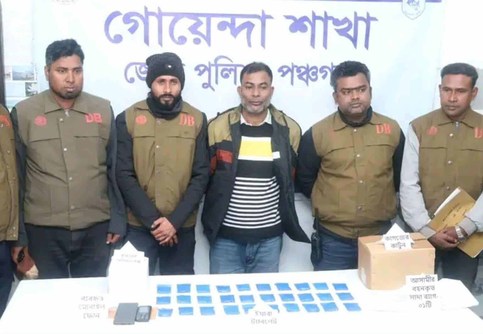 পঞ্চগড় জেলা পুলিশ সুপার মোঃ রবিউল ইসলাম নির্দেশে পঞ্চগড় জেলা পুলিশের নিয়মিত মাদক উদ্ধার ও চোরাচালান বিরোধী অভিযানের ধারাবাহিকতায় জেলা গোয়েন্দা শাখা (ডিবি) এর এসআই (নিরস্ত্র) মোঃ আবু হোসেন এর নেতৃত্বে একটি চৌকস টিম ২৪/১২/২০২৫ তারিখ বিকাল ১৫.৩০ ঘটিকায় গোপন সংবাদের মাধ্যমে জানতে পারেন যে, একজন মাদক কারবারি এস.এ পরিবহনের কুরিয়ার সার্ভিসের মাধ্যমে আসা মাদকের চালান পঞ্চগড় পৌরসভাস্থ ইসলামবাগ এস.এ কুরিয়ার সার্ভিস কার্যালয় হতে রিসিভ করবে। উক্ত গোয়েন্দা সংবাদের ভিত্তিতে পুলিশ সুপার, পঞ্চগড় নির্দেশনায় তাৎক্ষনিক ডিবি পুলিশের একটি চৌকস টিম এস.এ কুরিয়ার সার্ভিসের আশেপাশে গোপনে অবস্থান নেয়। গোয়েন্দা তথ্য মোতাবেক পেশাদার মাদক ব্যবসায়ী মোঃ আবুল কালাম (৪৫) পিতা-মোঃ আবুল হাতেম সাং-সেনপাড়া, আরাজি, গাইঘাটা, থানা-বোদা জেলা-পঞ্চগড় কৌশলে একটি সাদা ব্যাগসহ কুরিয়ার সার্ভিসের কার্যালয় হতে পায়ে হেঁটে বের হলে ডিবি পুলিশের টিম তাকে হেফাজতে নেয়। ডিবি পুলিশ উক্ত মাদক কারবারির সাথে থাকা সাদা ব্যাগটি ঘটনাস্থলে উপস্থিত লোকজনের সম্মুখে তল্লাশি করে ব্যাগটিতে থাকা খাকি রংয়ের কাগজের তৈরি একটি কার্টুন উদ্ধার করে। উক্ত কার্টুনটি খুলে বিশেষ কায়দায় সাদা রংয়ের সিলিকন রাবারের প্যাকেটে কসটেপ দিয়ে মোড়ানো তিনটি প্যাকেটে মোট ৩০টি নীল রং এর ছোট পলিথিনের প্যাকেটে সর্বমোট-৪৮০০ (চার হাজার আটশত) পিচ নেশা জাতীয় ইয়াবা ট্যাবলেট উদ্ধার করেন। যার অবৈধ বাজার মূল্য মোট-১৯,২০,০০০ (ঊনিশ লক্ষ বিশ হাজার) টাকা।