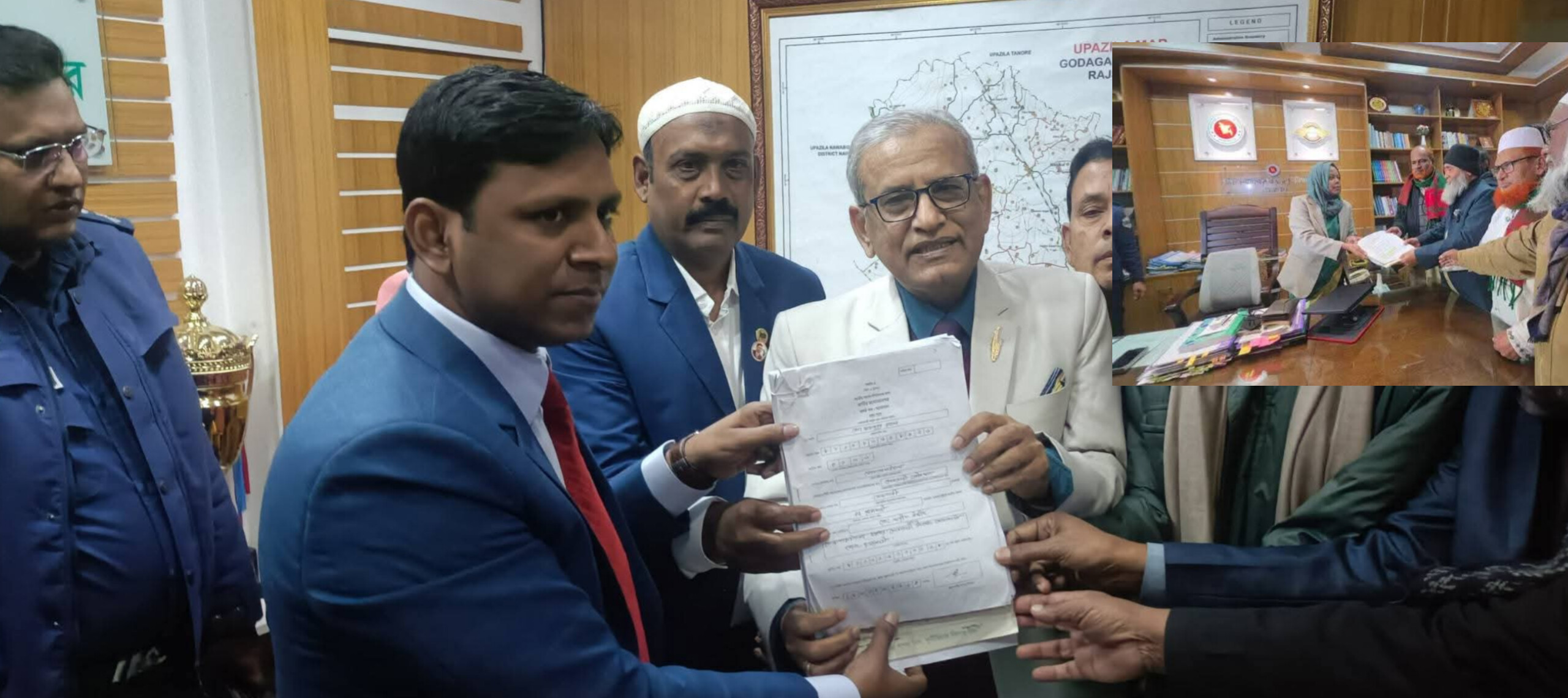 নিজস্ব প্রতিবেদক, রাজশাহীঃ ত্রয়োদশ জাতীয় সংসদ নির্বাচন- রাজশাহী ১ (গোদাগাড়ী-–তানোর) আসনে প্রতিদ্বন্দ্বিতার জন্য রাজশাহী–১ নির্বাচনী (গোদাগাড়ী–তানোর) গোদাগাড়ী উপজেলা নির্বাহী অফিসার ও সহকারী রিটার্নিং অফিসার মোঃ নাজমুস সাদাত রত্নের নিকট জামায়াতের মনোনীত প্রার্থী অধ্যাপক মুজিবুর রহমান মনোনয়নপত্র জমা দিচ্ছেন। সোমবার বিকালে জামায়াতের কেন্দ্রীয় নায়েবী আমির এ মনোনায়ন পত্র জমা দেন।