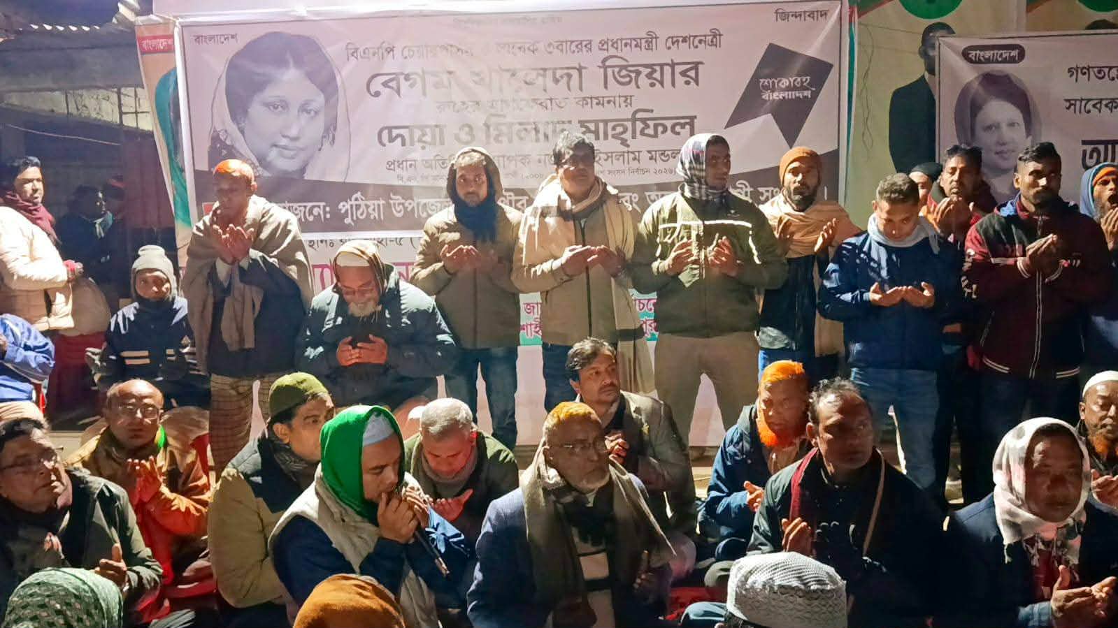 পুঠিয়ায় বিএনপির চেয়ারপার্সন সাবেক তিন বারের প্রধানমন্ত্রী বেগম খালেদা জিয়ার রুহের মাগফেরাত কামনায় দোওয়া ও মিলাদ মাহফিল আলোচনা সভা অনুষ্ঠিত হয়েছে। রবিবার (৪ জানুয়ারি) সন্ধ্যা ৭টায় পুঠিয়া সদরের ডাল মিল চত্বরে এ দোয়া ও মিলাদ মাহফিল আলোচনা আলোচনা সভার অনুষ্ঠানে প্রধান অতিথি হিসেবে বক্তব্য রাখেন, পুঠিয়া-দুর্গাপুরের বিএনপির মনোনিত ধানের শীষের প্রার্থী অধ্যাপক নজরুল ইসলাম মন্ডল। অনুষ্ঠানে বিশেষ অতিথি ছিলেন, সাবেক উপজেলা চেয়ারম্যান অনোয়ারুল ইসলাম জুম্মা, সাবেক পুঠিয়া পৌরসভার মেয়র আসাদুল হক আসাদ। সাবেক উপজেলা বিএনপির সিনিয়র সহ-সভাপতি একরামুল হক, সাবেক উপজেলা বিএনপির সাংগঠনিক সম্পাদক জয়নাল আবেদিন, পুঠিয়া উপজেলার সিনিয়র যুগ্ন আহবায়ক আবু হায়াতের সভাপতিত্বে অনুষ্ঠানে বক্তব্য রাখেন, পুঠিয়া পৌর বিএনপির সভাপতি বজলুর রহমান, সাধারণ সম্পাদক হাসিবুল ইসলাম, সুপ্রিম কোর্ট আইনজীবি ফোরামের যুগ্ন সম্পাদক ব্যারিস্টার রাজন মন্ডল, বিএনপি নেতা আতিক হাসান, কৃষক দলের আহবায়ক রিপন রেজা, সদস্য সচিব মাহাবুবুর রহমান, সেচ্ছাসেবক দলের সভাপতি ওয়াসিম আলী, সাধারণ সম্পাদক মিলন পারভেজ, জেলা যুবদলের সদস্য রানা মন্ডল প্রমুখ।#