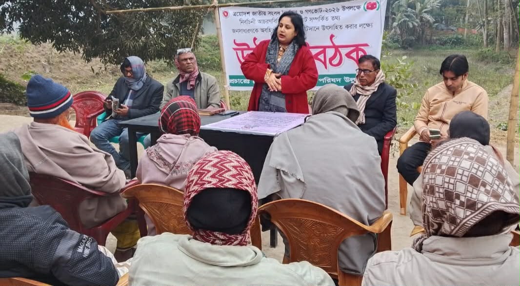 সংসদ নির্বাচন ও গণভোট উপলক্ষে সিরাজগঞ্জের সলঙ্গা পরিষদ কার্যালয়ে এক উঠান বৈঠক অনুষ্ঠিত হয়েছে।গতকাল দুপুরে সলঙ্গা ইউনিয়ন পরিষদে এ উঠান বৈঠক অনুষ্ঠিত হয়।ত্রয়োদশ জাতীয় সংসদ নির্বাচন ও গণভোট-২০২৬ উপলক্ষে নির্বাচনী আচরণ বিধি ও গণভোট সম্পর্কিত তথ্য জনসাধারণকে অবহিত করণ এবং ভোটদানে উৎসাহিত করার লক্ষ্যে এ উঠান বৈঠক করা হয়।উল্লাপাড়া উপজেলা কৃষি কর্মকর্তা,৮ নং সলঙ্গা ইউনিয়ন পরিষদের প্রশাসক কৃষিবিদ সুবর্ণা ইয়াসমিন সুমি উঠান বৈঠকে বিস্তারিত বর্ণনা করেন।এ সময় ইউনিয়ন পরিষদ গ্রাম আদালতের বিচারক রফিকুল ইসলাম মন্টু,সকল ইউপি সদস্য ও স্থানীয় গণ্যমান্য ব্যক্তিবর্গ উপস্থিত ছিলেন।