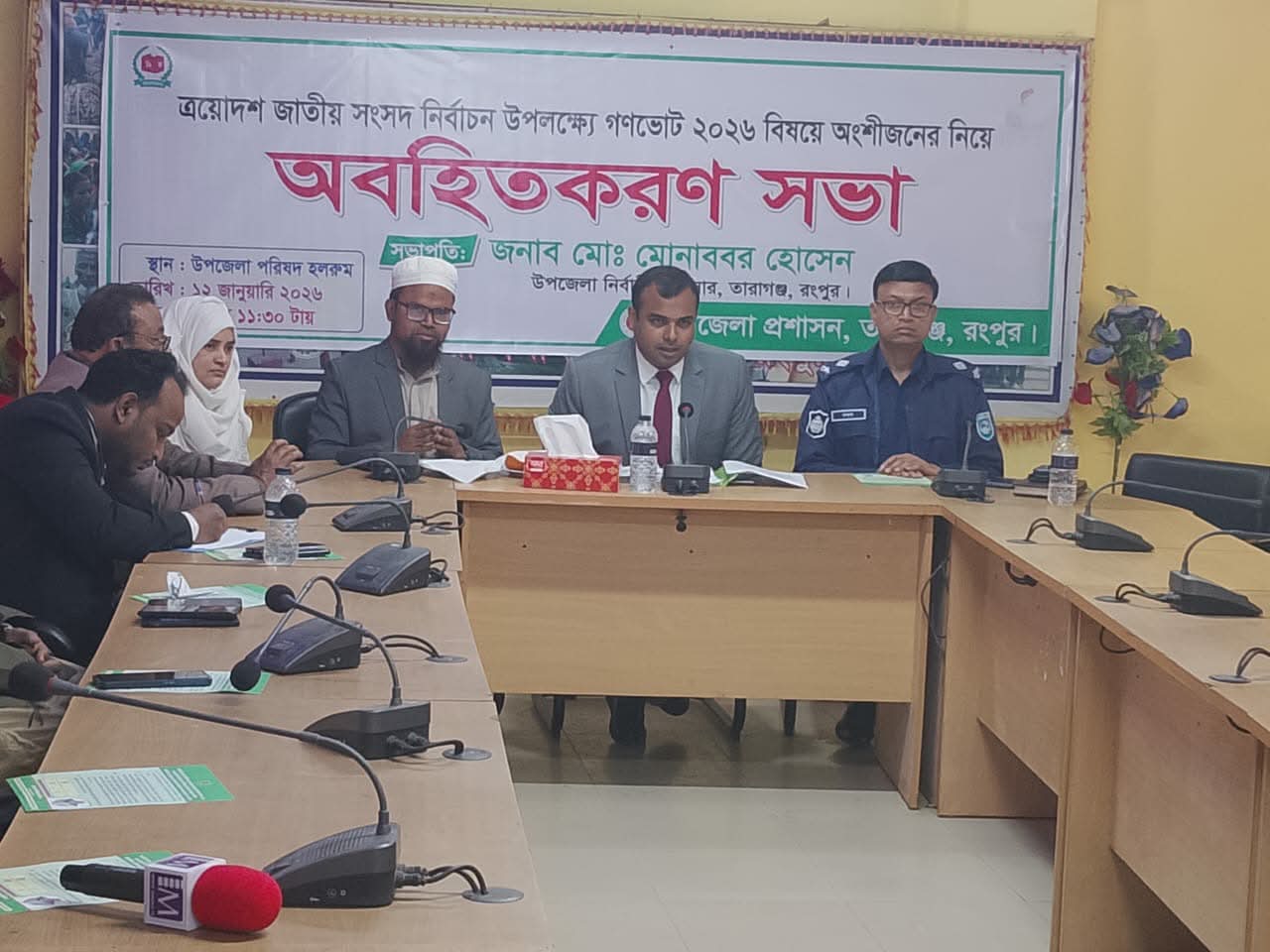আসন্ন জাতীয় সংসদ নির্বাচন উপলক্ষে গণভোট ২০২৬ বিষয়ে অংশীজনদের নিয়ে এক অবহিতকরণ সভা তারাগঞ্জ উপজেলা পরিষদের হলরুমে অনুষ্ঠিত হয়েছে।