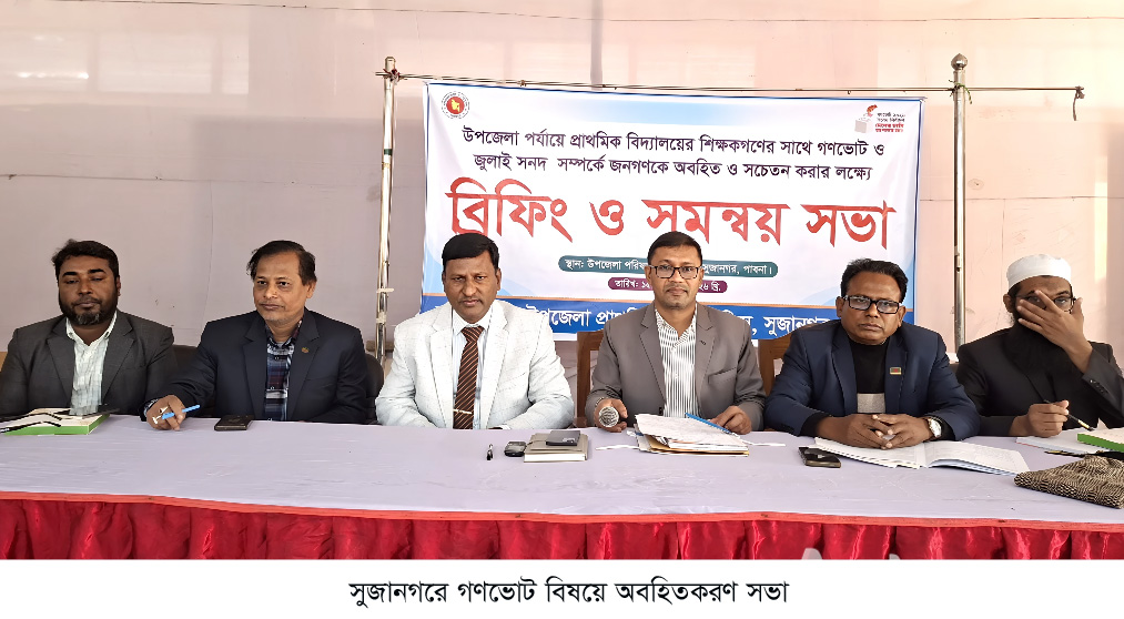 এম এ আলিম রিপন,সুজানগরঃ পাবনার সুজানগর উপজেলায় প্রাথমিক বিদ্যালয়ের শিক্ষকদের সাথে গণভোট ও জুলাই সনদ সম্পর্কে জনগণকে অবহিত ও সচেতন করার লক্ষ্যে সমন্বয় সভা অনুষ্ঠিত হয়েছে। উপজেলা পরিষদ মিলনায়তনে বৃহস্পতিবার উপজেলার সকল প্রাথমিক বিদ্যালয়ের প্রধান শিক্ষকদের অংশগ্রহণে এ সভা অনুষ্ঠিত হয় । সুজানগর উপজেলা প্রাথমিক শিক্ষা অফিসার বাবুল আখতারের সভাপতিত্বে অনুষ্ঠিত এ সভায় প্রধান অতিথির বক্তব্য দেন পাবনা জেলা প্রাথমিক শিক্ষা অফিসার আশরাফুল কবির। বিশেষ অতিথি ছিলেন জেলা সহকারী প্রাথমিক শিক্ষা আতাউর রহমান। সভায় অন্যদের মাঝে বক্তব্য দেন উপজেলা সহকারী প্রাথমিক শিক্ষা অফিসার কাজী আবুল কালাম আজাদ, নিশীথ কুমার বিশ্বাস, জাহাঙ্গীর আলম, মোমিন উদ্দিন, এবিএম রফিকুল হাসান খান ও মাজহারুল ইসলাম। সভায় গণভোট ২০২৬ কর্মসূচির গুরুত্ব, ভোটার সচেতনতা বৃদ্ধি, নির্বাচনকালীন আচরণবিধি বাস্তবায়ন এবং সাধারণ মানুষের মাঝে নির্বাচন সংক্রান্ত তথ্য পৌঁছে দেওয়ার জন্য প্রচার-প্রচারণা বিষয়ে আলোচনা করা হয়। এছাড়া সুষ্ঠু, অবাধ ও শান্তিপূর্ণ নির্বাচন নিশ্চিত করতে সংশ্লিষ্ট সকলের সম্মিলিত ভূমিকা নেওয়ার ওপর গুরুত্বারোপ করা হয়।সভায় বক্তারা আরো জানান, এই ধরনের সচেতনতামূলক কার্যক্রম ভোটার উপস্থিতি বৃদ্ধি ও নির্বাচনের স্বচ্ছতা নিশ্চিত করতে গুরুত্বপূর্ণ ভূমিকা রাখবে। উল্লেখ্য, বাংলাদেশে আগামী ১২ ফেব্রুয়ারি ২০২৬ তারিখে ত্রয়োদশ জাতীয় সংসদ নির্বাচনের পাশাপাশি একটি ঐতিহাসিক সাংবিধানিক গণভোট অনুষ্ঠিত হতে যাচ্ছে। এই গণভোট সম্পর্কে সাধারণ মানুষকে সচেতন করতে এবং ভোটের প্রক্রিয়া ব্যাখ্যা করতে বর্তমানে দেশজুড়ে সরকারি উদ্যোগের অংশ হিসেবে সুজানগর উপজেলায়ও এ সভা অনুষ্ঠিত হয়।