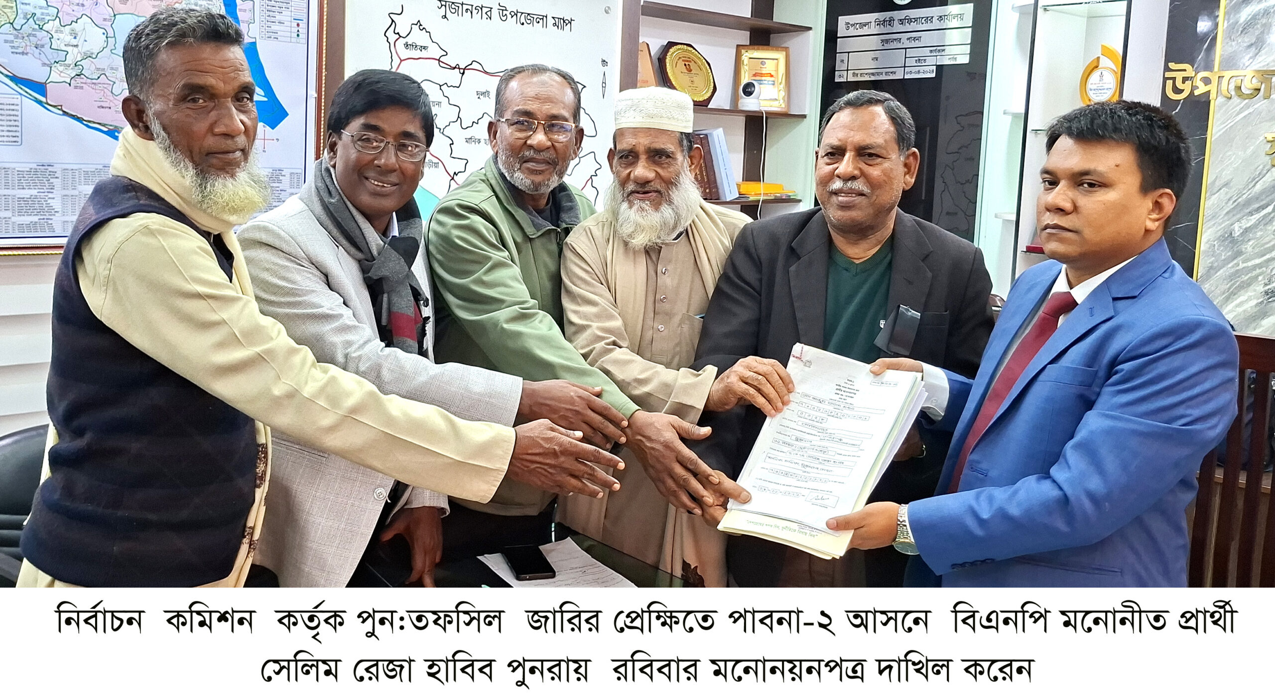 এম এ আলিম রিপন,সুজানগরঃ নির্বাচন কমিশন কর্তৃক পুন:তফসিল জারির প্রেক্ষিতে জাতীয় সংসদ নির্বাচনে পাবনা-২ আসন থেকে বিএনপি মনোনীত ধানের শীষ প্রতীকের প্রার্থী বিএনপির জাতীয় নির্বাহী কমিটির সদস্য ও সাবেক সংসদ সদস্য অ্যাডভোকেট এ.কে.এম সেলিম রেজা হাবিব পুনরায় মনোনয়নপত্র দাখিল করেছেন। রবিবার (১৮ জানুয়ারী) মনোনয়নপত্র দাখিলের শেষ দিনে সুজানগর উপজেলা নির্বাহী অফিসার ও সহকারী রিটার্নিং অফিসার মীর রাশেদুজ্জামান রাশেদের নিকট সেলিম রেজা হাবিব মনোনয়ন পত্র দাখিল করেন। এ সময় উপজেলা নির্বাচন অফিসার সাগর আহমেদ, সুজানগর উপজেলা বিএনপির সাবেক সভাপতি আলহাজ্ব আজম আলী বিশ্বাস, সুজানগর উপজেলা বিএনপির সাবেক সাধারণ সম্পাদক হাজারী জাকির হোসেন চুন্নু, সুজানগর পৌর বিএনপির সাবেক যুগ্ন আহ্বায়ক অধ্যাপক আব্দুল মোনায়েম ও বিএনপি নেতা আহমেদ আলী প্রামানিক প্রমুখ উপস্থিত ছিলেন। মনোনয়ন পত্র দাখিল শেষে অ্যাডভোকেট এ.কে.এম সেলিম রেজা হাবিব সাংবাদিকদের সঙ্গে কথা বলেন। এ সময় তিনি বলেন, আমি দৃঢ়ভাবে বিশ্বাস করি, পাবনা-২ নির্বাচনী এলাকার মানুষ ধানের শীষে ভোট দেওয়ার জন্য মুখিয়ে আছে। ধানের শীষ ছাড়া অন্য কাউকে বেছে নেওয়ার সম্ভাবনা খুবই কম। নির্বাচিত হলে এলাকার উন্নয়ন এবং সমাজ থেকে মাদক, সন্ত্রাস ও চঁাদাবাজি নির্মূলে কাজ করবেন বলেও জানান তিনি। এ সময় উপস্থিত ছিলেন উপজেলা বিএনপির সাবেক দপ্তর সম্পাদক অধ্যক্ষ নাদের হোসেন, উপজেলা বিএনপির যুগ্ন আহ্বায়ক রাশেদুল ইসলাম বাবু মন্ডল, সুজানগর পৌরসভার সাবেক কাউন্সিলর আনিছুর রহমান খোকন, উপজেলা যুবদলের আহ্বায়ক সিদ্দিকুর রহমান পিন্টু, সদস্য সচিব রিয়াজ মন্ডল,সাবেক যুবনেতা আরিফুল ইসলাম টুটুল, উপজেলা ছাত্রদল নেতা এরশাদ, এস এম আফতাব,শেখ রুবেল, সংগ্রাম,আব্দুস সবুর জয়, সহ সুজানগর ও বেড়া উপজেলা বিএনপি এবং অঙ্গ ও সহযোগী সংগঠনের নেতাকর্মীরা উপস্থিত ছিলেন।