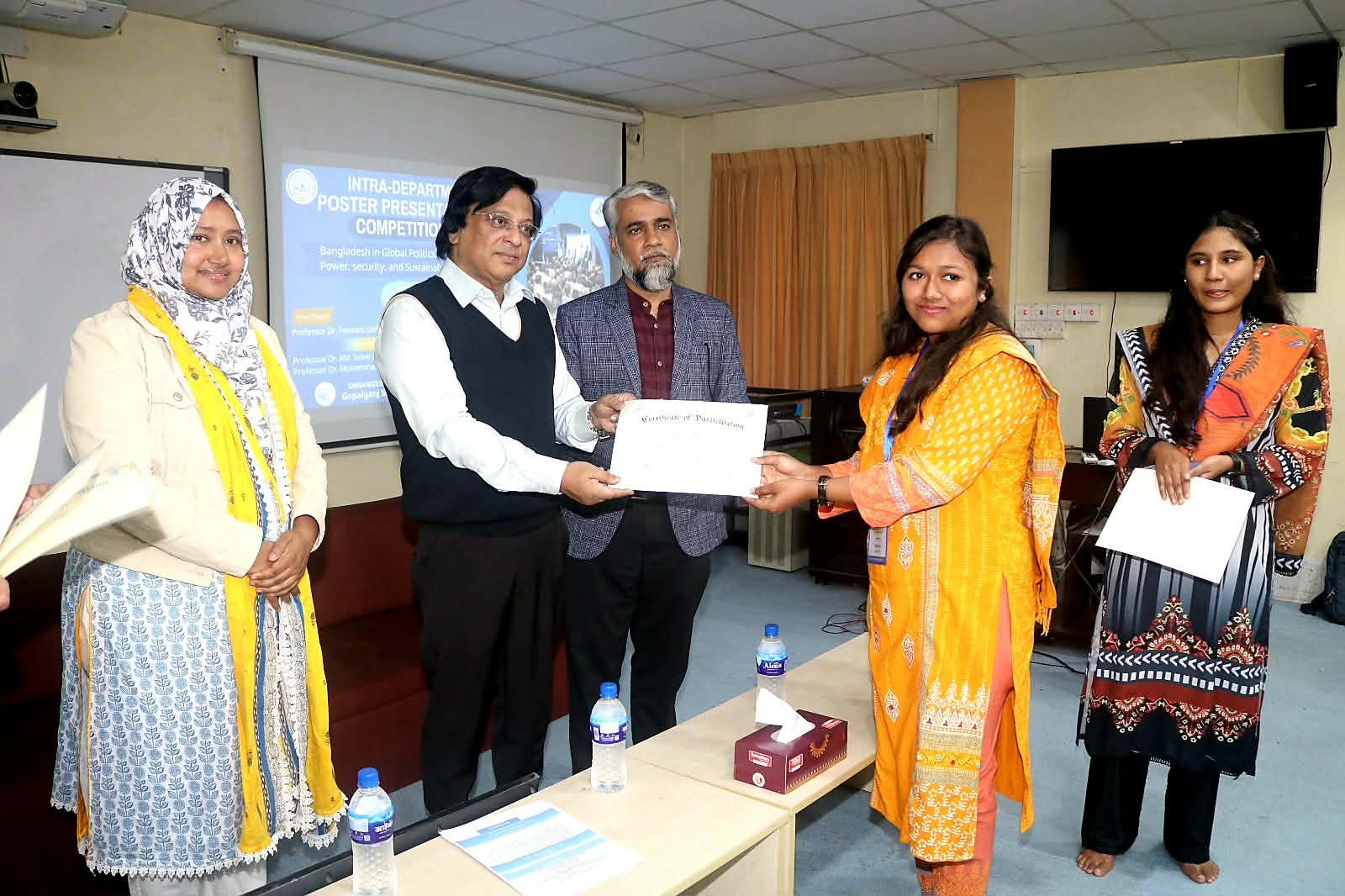 বিকেল তিনটায় বিশ্ববিদ্যালয়ের একাডেমিক ভবনের ৫০১ নং কক্ষে সনদ বিতরণী অনুষ্ঠানে প্রধান অতিথির বক্তব্যে উপাচার্য অধ্যাপক ড. হোসেন উদ্দিন শেখর বলেন, ভৌগোলিক অবস্থানগত কারণেই বাংলাদেশ বিশ্ব রাজনীতিতে একটি গুরুত্বপূর্ণ রাষ্ট্র। নেভিগেটিং পাওয়ার, সিকিউরিটি, সাসটেইনেবল ডেভেলপমেন্ট, প্রতিটি বিষয় বাংলাদেশের মতো রাষ্ট্রের জন্য সমান গুরুত্ব রাখে। যার ওপর দেশের সার্বিক উন্নয়ন নির্ভর করে। সম্ভবত বিশ্ববিদ্যালয়ে প্রথমবার এই বিষয়কে কেন্দ্র করে পোস্টার প্রেজেন্টেশন প্রতিযোগিতার আয়োজন করা হয়েছে। আমি প্রত্যাশা করছি, এমন আয়োজন নিয়মিতভাবে করা হবে। এবং এই প্রতিযোগিতা শুধু নিজেদের মধ্যে নয়, বরং আন্তঃবিশ্ববিদ্যালয়ে করা দরকার। যা শিক্ষার্থীদের একাডেমিক ক্যারিয়ার গঠনে ভূমিকা পালন করবে।