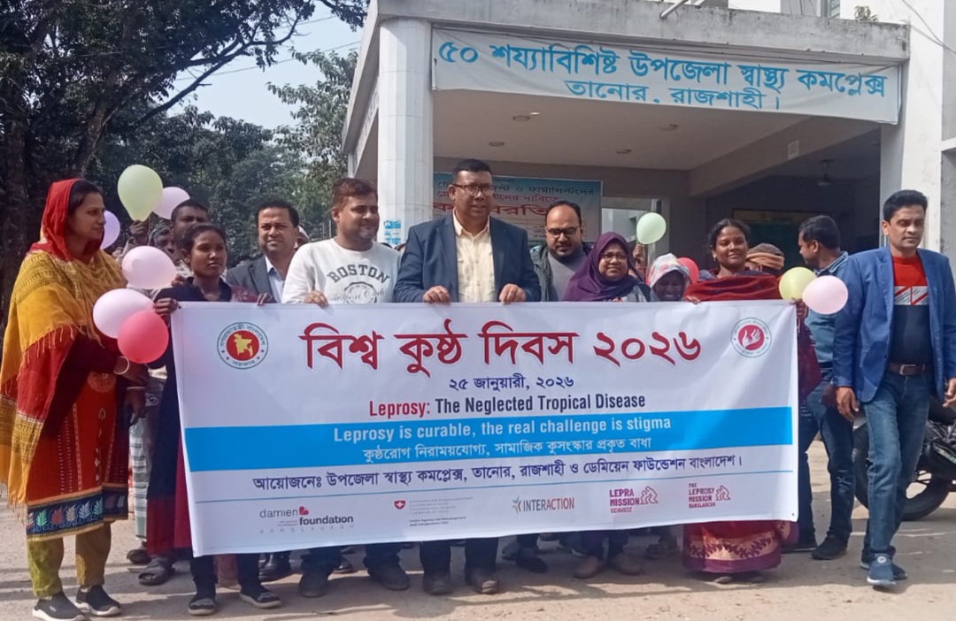 ‘কুষ্ঠরোগ নিরাময়যোগ্য,সামাজিক কুসংস্কার প্রকৃত বাধা-এই প্রতিপাদ্যকে সামনে রেখে রাজশাহীর তানোর উপজেলা স্বাস্থ্য কমপ্লেক্সের আয়োজনে বিশ্ব কুষ্ঠ দিবস উপলক্ষে র্যালি ও আলোচনা সভা অনুষ্ঠিত হয়েছে। কর্মসূচির মধ্যে ছিল র্যালি,আলোচনা সভা,রোগী সনাক্তকরণ সার্ভে প্রোগ্রাম ও মাইকিং।