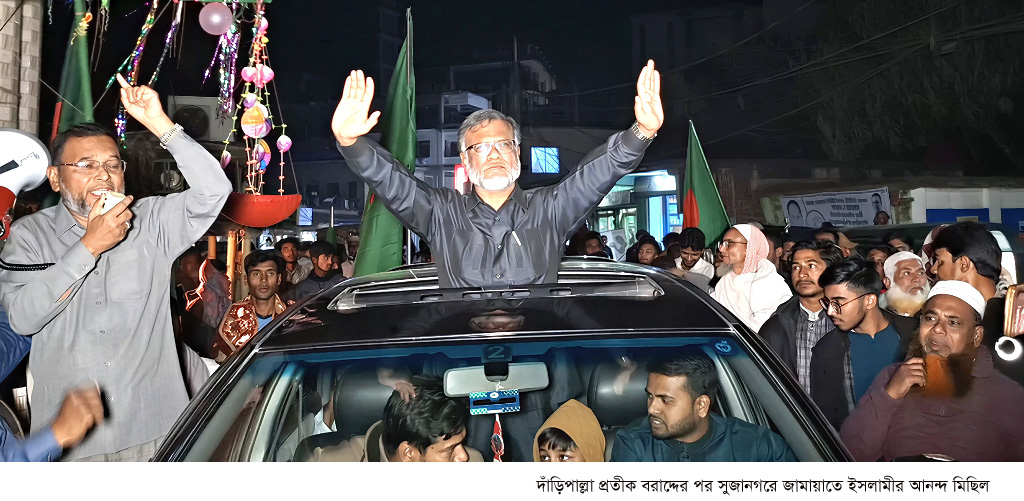 এম এ আলিম রিপন,সুজানগরঃ পাবনা-২ সংসদীয় আসনে জামায়াতে ইসলামী মনোনীত সংসদ সদস্য প্রার্থী কে.এম হেসাব উদ্দিনকে দঁাড়িপাল্লা প্রতীক বরাদ্দ দেওয়ায় আনন্দ মিছিল করেছে জামায়াতে ইসলামী এবং দশ দলীয় জোটের নেতাকর্মীরা। মঙ্গলবার সন্ধ্যায় উপজেলা জামায়াত ও সহযোগী অঙ্গ সংগঠনের উদ্যোগে সুজানগর পৌর শহরে এ বর্ণাঢ্য আনন্দ মিছিল বের করা হয়। মিছিলটি জিরো পয়েন্ট মোড় থেকে শুরু হয়ে পৌর শহরের প্রধান প্রধান সড়ক প্রদক্ষিণ করে উপজেলা পরিষদ মোড়ের সামনে গিয়ে সংক্ষিপ্ত সমাবেশের মাধ্যমে শেষ হয়। এ সময় নেতাকর্মীদের দঁাড়িপাল্লা প্রতীক স্লোগানে স্লোগানে মুখরিত হয়ে ওঠে। সুজানগর পৌর জামায়াতের আমীর রফিকুল ইসলাম খানের সভাপতিত্বে সমাবেশে প্রধান অতিথির বক্তব্য দেন পাবনা-২ আসনের জামায়াত ইসলামী মনোনীত প্রার্থী কে.এম হেসাব উদ্দিন। অন্যান্যদের মাঝে বক্তব্য দেন শ্রমিক কল্যাণ ফেডারেশন পাবনা জেলা শাখার সহ সভাপতি দেলোয়ার হোসেন, আসন নির্বাচন পরিচালনা কমিটির সদস্য সচিব ও সুজানগর উপজেলা জামায়াতের নায়েবে আমীর ফারুক-ই আযম, উপজেলা সেক্রেটারী(ভারপ্রাপ্ত) মোস্তাফিজুর রহমান মোস্তাক, অর্থ সম্পাদক রাফি আহমেদ ফুল, জেলা জামায়াতের আইন সম্পাদক আসাদুজ্জামান আসাদ, পৌর জামায়াতের নায়েবে আমীর আব্দুল মমিন, সেক্রেটারী মকবুল হোসেন বকুল, সাংগঠনিক সম্পাদক কেরামত হোসেন, জেলা ছাত্রশিবিরের সাবেক সেক্রেটারী আবুল কালাম আজাদ, জেলা ছাত্রশিবিরের ছাত্র অধিকার সম্পাদক শাহরিয়ার হাসান জিহাদ, সদর পূর্ব সাংগঠনিক থানার সভাপতি আব্দুল মমিন, উপজেলা ছাত্রশিবিরের অফিস সম্পাদক হাফেজ তামজিদ আহমেদ, পৌর ছাত্রশিবিরের সভাপতি নাসিম উদ্দিন, সেক্রেটারী মিরাজুল ইসলাম ও সাংগঠনিক সম্পাদক হাফেজ নাফিজ হোসেন প্রমুখ। সমাবেশে প্রধান অতিথির বক্তব্যে জামায়াতে ইসলামী মনোনীত এমপি প্রার্থী কে এম হেসাব উদ্দিন বলেন, আমরা সবাই মিলে একটি ইনসাফভিত্তিক পাবনা-২ নির্বাচনী এলাকা গড়ে তুলতে চাই। এ অঞ্চলের প্রতিটি গ্রামকে স্মার্ট ভিলেজে রূপান্তর এবং প্রতিটি জনপদকে সন্ত্রাস ও চঁাদাবাজমুক্ত আধুনিক জনপদ হিসেবে গড়ে তোলাই আমাদের লক্ষ্য। এ জন্য আমি সকলের দোয়া ও সহযোগিতা কামনা করছি। ইনশাআল্লাহ, আপনাদেরকে সঙ্গে নিয়েই একটি সুন্দর ও স্মার্ট পাবনা-২ অঞ্চল গড়ে তুলবো।এ সময় তিনি আরো বলেন , আগামী ১২ তারিখ জাতীয় সংসদ নির্বাচনে জনগণ ন্যায়, ইনসাফ ও সৎ নেতৃত্বের পক্ষে রায় দেবে এবং দঁাড়িপাল্লা প্রতীক বিজয়ী হবে ইনশআল্লাহ বলেও আশাবাদ ব্যক্ত করেন।