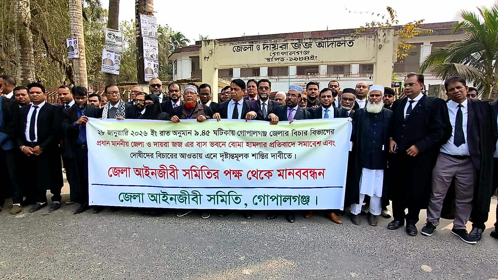 গোপালগঞ্জ জেলা আইনজীবী সমিতির উদ্যোগে বৃহস্পতিবার (২৯ জানুয়ারি) দুপুরে জেলা ও দায়রা জজ আদালতের মেইন ফটকের সামনে বঙ্গবন্ধু সড়কে দাঁড়িয়ে তারা প্রায় ঘন্টা ব্যাপী এ মানববন্ধন কর্মসূচি পালন করে।