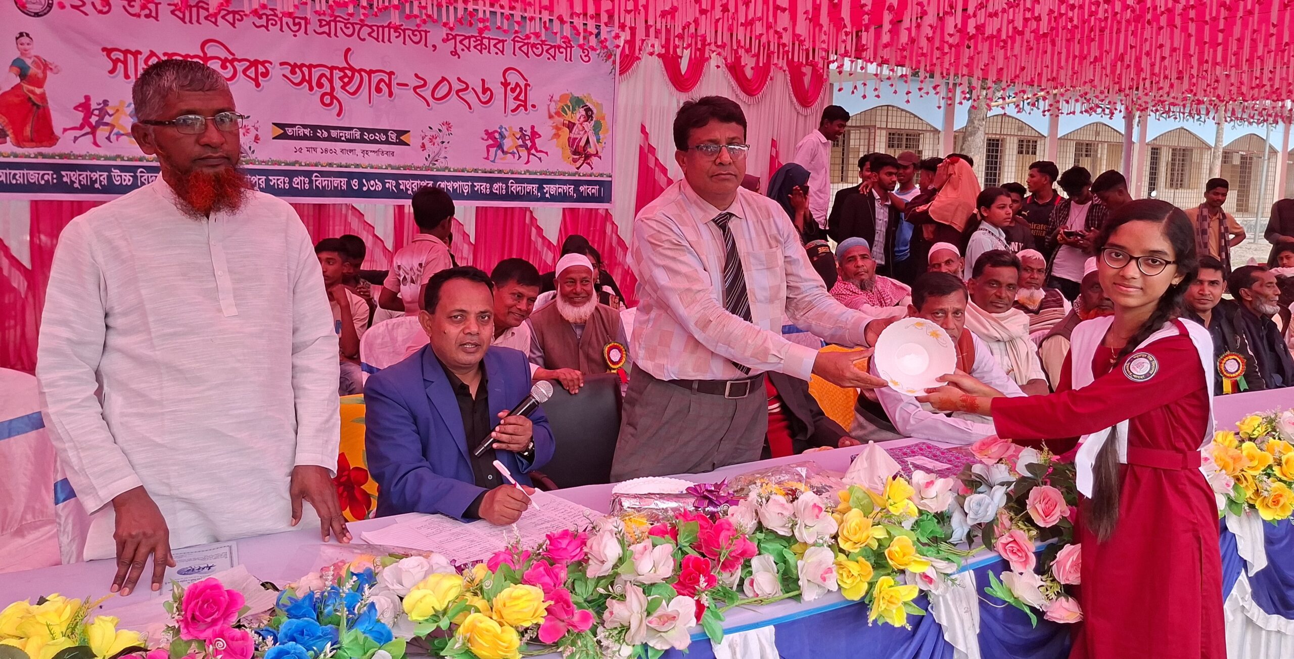 এম এ আলিম রিপন,সুজানগর ঃ পাবনার সুজানগর উপজেলার ভাঁয়না ইউনিয়নের মথুরাপুর উচ্চ বিদ্যালয়, মথুরাপুর সরকারি প্রাথমিক বিদ্যালয় ও মথুরাপুর শেখপাড়া সরকারি প্রাথমিক বিদ্যালয়ের বার্ষিক ক্রীড়া প্রতিযোগিতা ও পুরস্কার বিতরণী অনুষ্ঠিত হয়েছে। বৃহস্পতিবার সকালে বার্ষিক এ ক্রীড়া প্রতিযোগিতার আনুষ্ঠানিক উদ্বোধন করেন উপজেলা প্রাথমিক শিক্ষা অফিসার বাবুল আক্তার। আমন্ত্রিত অতিথি ছিলেন উপজেলা একাডেমিক সুপারভাইজার মনোয়ার হোসেন ও উপজেলা পল্লী উন্নয়ন কর্মকর্তা শামীম হোসেন।