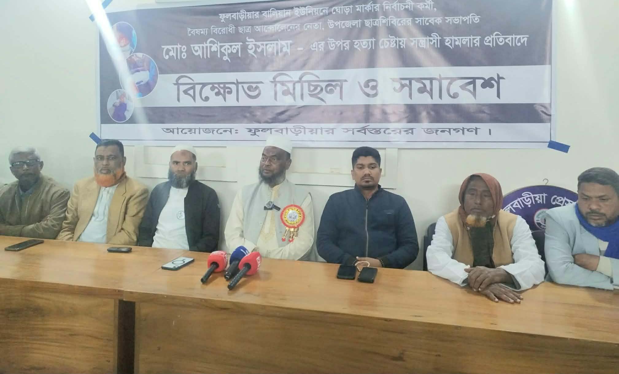 এদিকে ময়মনসিংহ–৬ ফুলবাড়ীয়া আসনের স্বতন্ত্র সংসদ প্রার্থী অধ্যাপক জসিম উদ্দিনের নির্বাচনী কর্মী আশিকুর রহমানের উপর হা/ম/লা/র প্রতিবাদে শুক্রবার রাতে উপজেলা শহরে ঘোড়া মার্কার সমর্থকদের বিক্ষোভ মিছিল করেছে উপজেলার প্রতিবাদী জনতা।