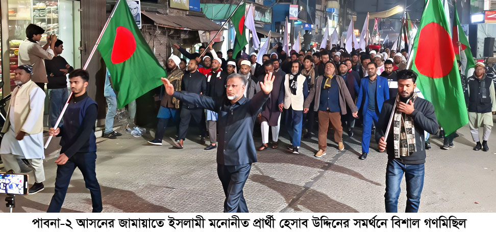 পাবনা-২ আসনের জামায়াতে ইসলামী মনোনীত প্রার্থী হেসাব উদ্দিনের স-মর্থনে বিশাল গণমিছিল