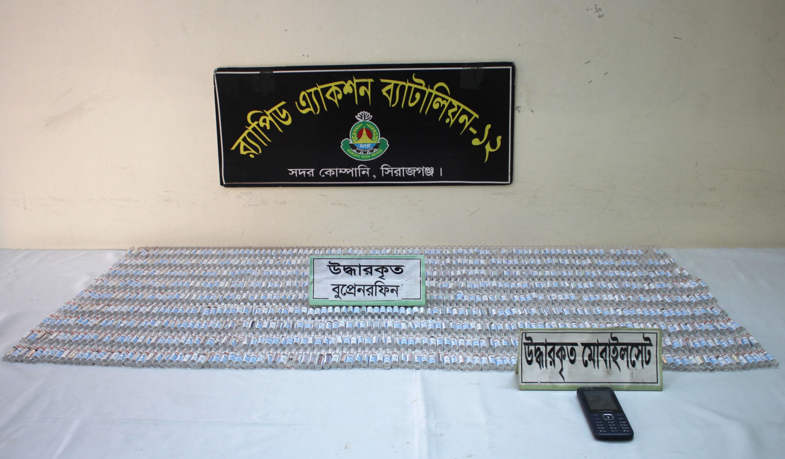 ১। এরই ধারাবাহিকতায় অধিনায়ক র্যাব-১২, সিরাজগঞ্জ মহোদয়ের দিকনির্দেশনায় এবং র্যাবের গোয়েন্দা শাখার সহযোগিতায় গত ১৫ ফেব্রুয়ারি ২০২৬ খ্রিঃ দুপুর ১১.৫০ ঘটিকায় র্যাব-১২, সদর কোম্পানির একটি চৌকষ আভিযানিক দল ‘‘সিরাজগঞ্জ জেলার সলঙ্গা থানাধীন হাটিকুমরুল সাকিনস্থ হোটেল নিউ মায়ের আঁচল এর সামনে বগুড়া হতে ঢাকাগামী মহাসড়কের উপর’’ একটি মাদক বিরোধী অভিযান পরিচালনা করে যাত্রীবাহী বাসে মাদক পরিবহন কালে ৯৬০ পিস নেশাজাতীয় বুপ্রেনরফিন ইনজেকশনসহ ০১ জন মাদক কারবারীকে গ্রেফতার করতে সক্ষম হয়। এছাড়াও তার সাথে থাকা মাদকদ্রব্য ক্রয়-বিক্রয়ের কাজে ব্যবহৃত ০১টি মোবাইল ফোন জব্দ করা হয়।