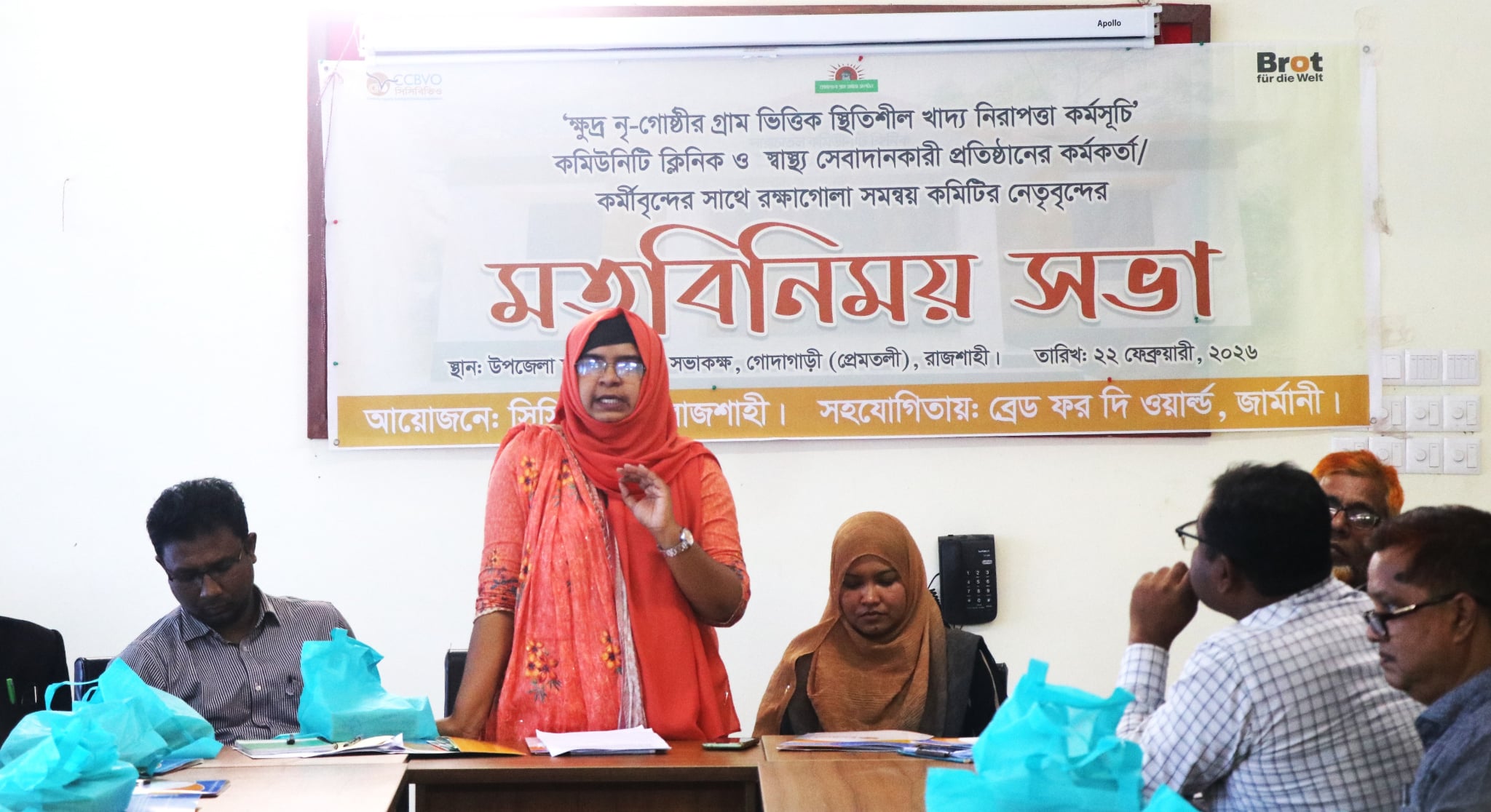 রাজশাহী থেকে মোঃ হায়দার আলীঃ রাজশাহীর গোদাগাড়ী উপজেলা স্বাস্থ্য কমপ্লেক্স (প্রেমতলী) সভাকক্ষে সিসিবিভিওর আয়োজনে ও ব্রেড ফর দ্যা ওয়ার্ল্ড জার্মানীর সহায়তায় ‘ক্ষুদ্র নৃ-গোষ্ঠীর গ্রাম ভিত্তিক স্থিতিশীল খাদ্য নিরাপত্তা কর্মসূচী’-এর আওতায় কমিউনিটি ক্লিনিক ও স্বাস্থ্য সেবাদানকারী কর্মকর্তা ও কর্মীবৃন্দের সাথে রক্ষাগোলা সমন্বয় কমিটির সদস্যবৃন্দের মতবিনিময় সভা অনুষ্ঠিত হয়েছে।