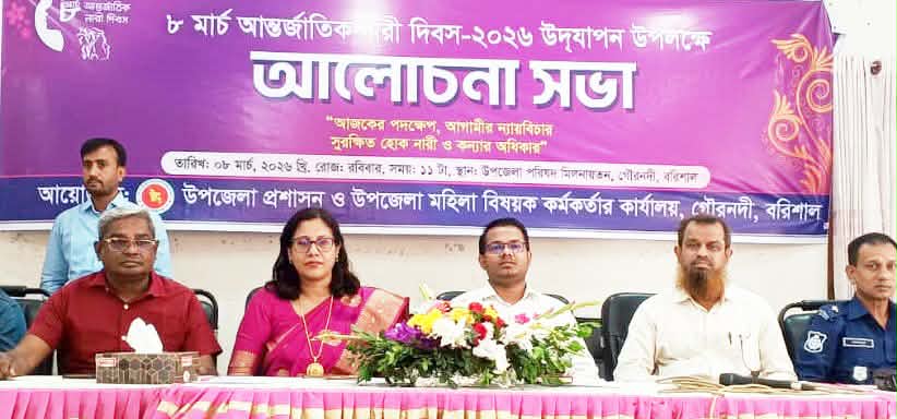 “আজকের পদক্ষেপ, আগামীর ন্যায় বিচার, সুরক্ষিত হোক নারী ও কন্যার অধিকার” এই প্রতিপাদ্যকে সামনে রেখে বরিশালের গৌরনদীতে আন্তর্জাতিক নারী দিবস ২০২৬ উপলক্ষে র্যা লী ও আলোচনা সভা অনুষ্ঠিত হয়েছে। রবিবার (৮ মার্চ) সকাল ১১টায় গৌরনদী উপজেলা পরিষদ মিলনায়তনে উপজেলা প্রশাসন ও উপজেলা মহিলা বিষয়ক কর্মকর্তার কার্যালয়ের আয়োজনে এ আলোচনা সভা অনুষ্ঠিত হয়।