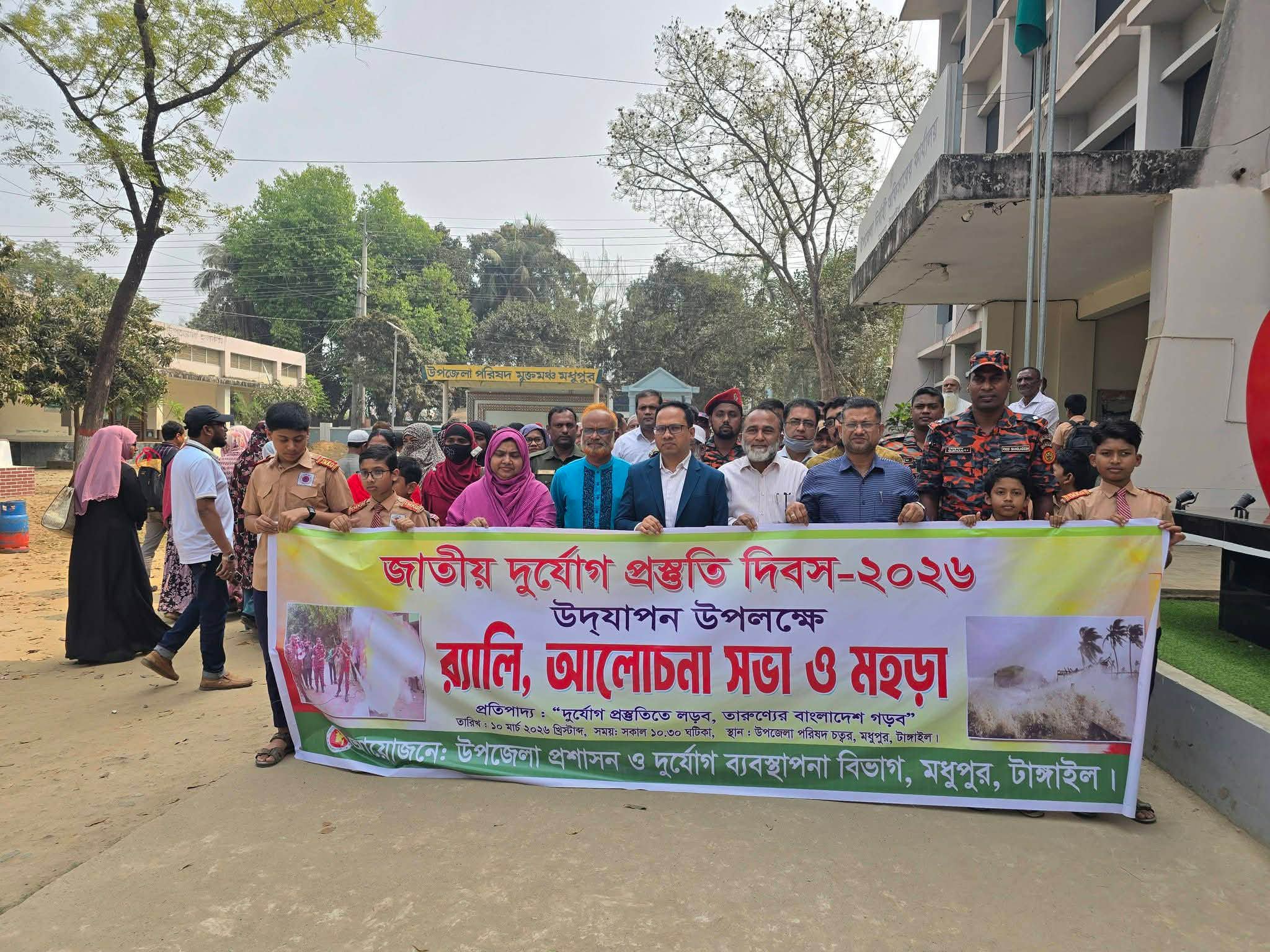 টাঙ্গাইলের মধুপুরে জাতীয় দুর্যোগ প্রস্তুতি দিবস ২০২৬ উদযাপন উপলক্ষে র্যালী আলোচনা সভা ও মহড়া অনুষ্ঠিত হয়েছে।