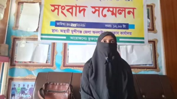 লিটন মাহমুদ, মুন্সীগঞ্জ প্রতিনিধি: মুন্সীগঞ্জে মাহমুদা সিকদার লিজা (৩৭) নামে এক যুবতী বিয়ের দাবীতে সংবাদ সম্মেলন করেছেন। সোমবার দুপুরে মুন্সীগঞ্জ জেলা অনলাইন প্রেসক্লাবে এ সংবাদ সম্মেলন করেন। মুন্সীগঞ্জের টঙ্গীবাড়ি উপজেলার read more