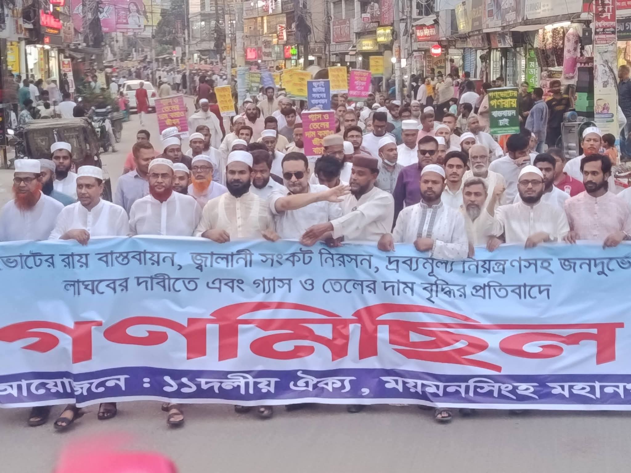 গণভোটের রায় বাস্তবায়ন, তেল-গ্যাস-বিদ্যুৎ সঙ্কট নিরসন, দ্রব্যমূল্যের ঊর্ধ্বগতি নিয়ন্ত্রণ এবং সারাদেশে শিক্ষাঙ্গনে সন্ত্রাসের প্রতিবাদে ময়মনসিংহে গণমিছিল ও সমাবেশ করেছে মহানগর ১১ দলীয় ঐক্য জোট।